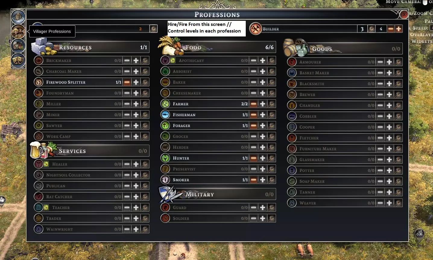 职业界面 你可以在一个界面中监控当前所有工作岗位。通过精细的控制进行雇佣/解雇操作,能够微调经济或调整人员的工作分配。部分工作岗位可容纳2至6名居民。当你的城镇规模尚小,无法充分利用更多工人时,可以关闭暂时不需要的岗位槽位。