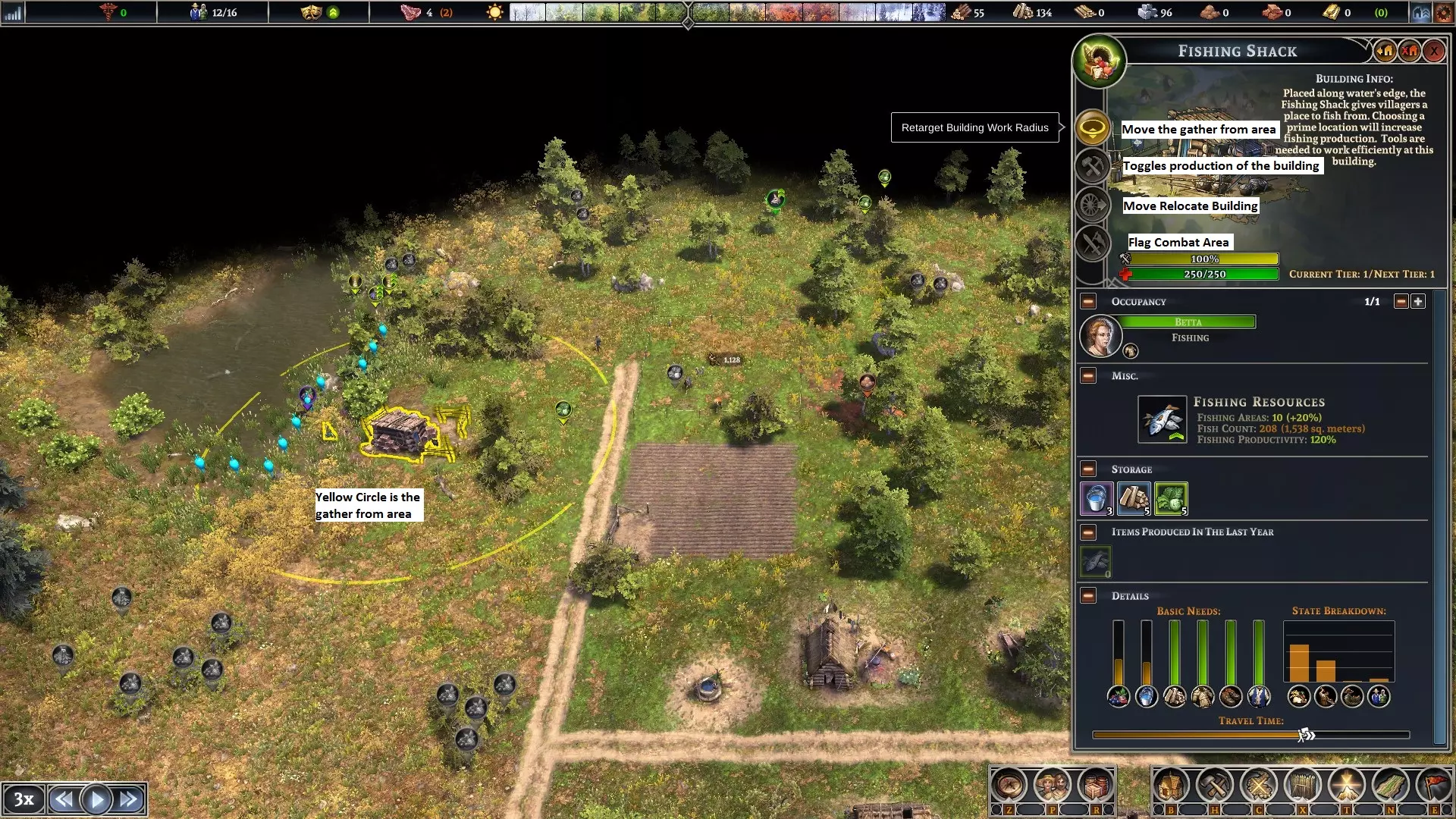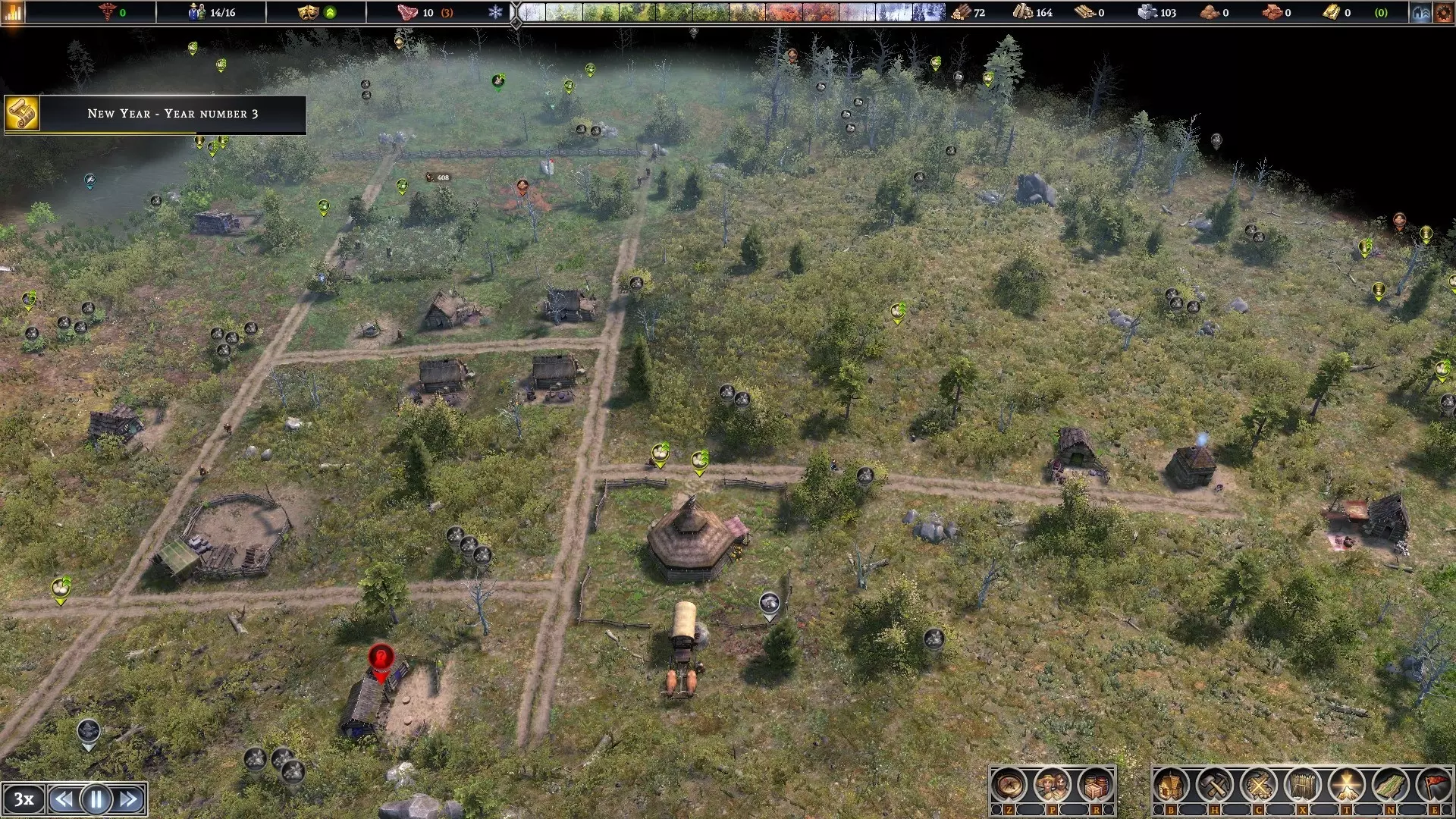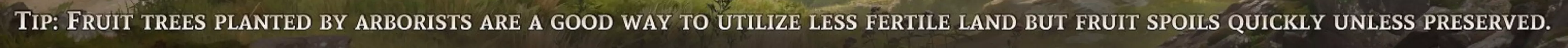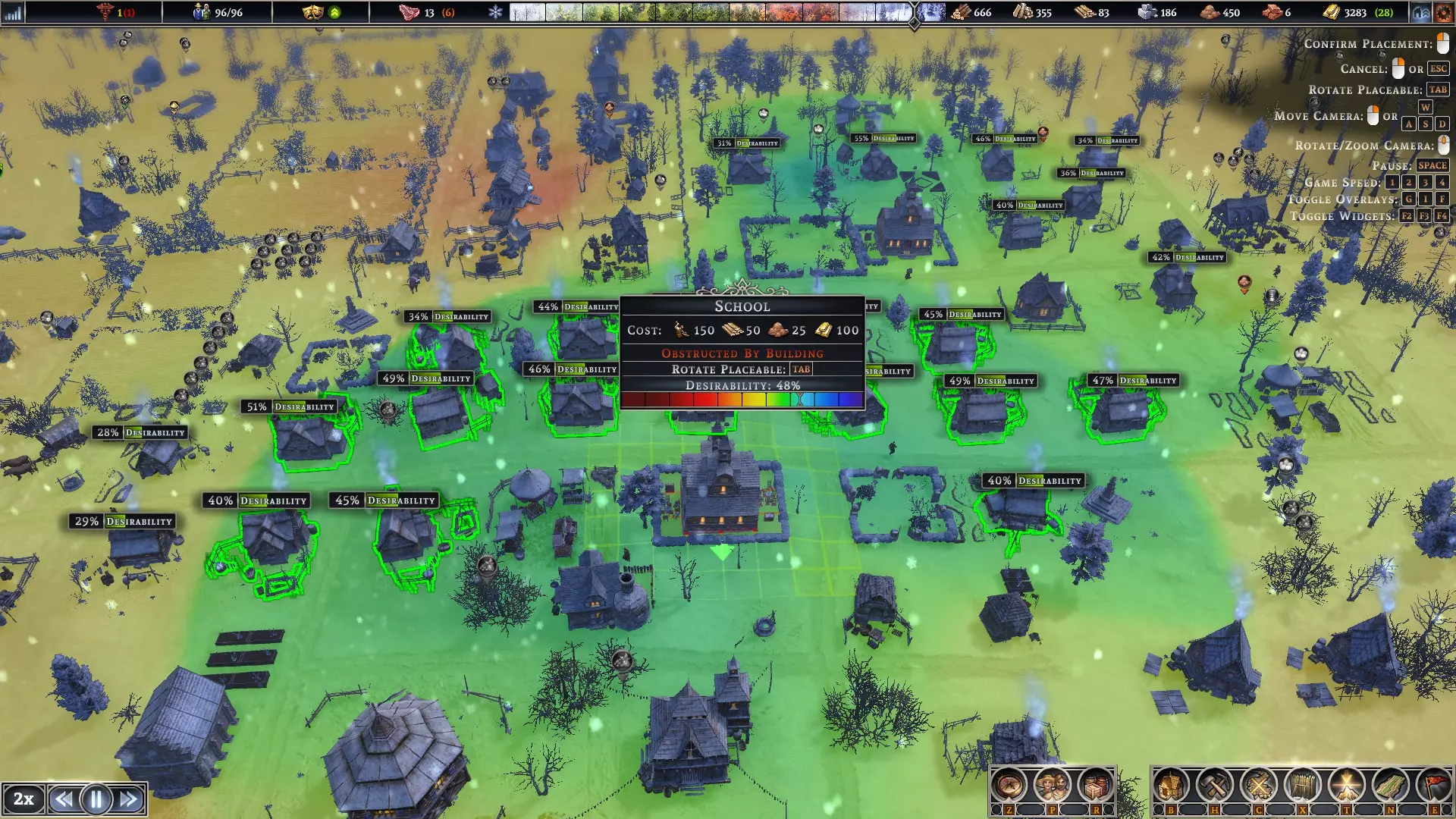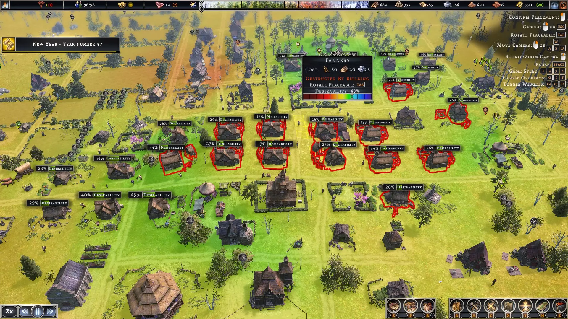蜂房——我没发现将其放置在农场或果园有什么区别。它们在蓝莓灌木丛附近效果也很好。可以将蓝莓灌木丛集中种植,并在旁边放置蜂房。 为获得最佳生产效率,应确保仓库、住所和工作场所之间的往返时间尽可能短。如果工人需要穿过整个城镇去获取制作物品所需的材料,那是没有好处的,他们的工作时间会被走路消耗掉。 农田地块建议以3个为一组建造。每组中应有一块农田每3年种植1年三叶草,这有助于保持土壤肥力。 游戏初期的木材/石料设置包括:工作营地、临时住所和水井。目前“仅移除成熟树木”的复选框存在问题。要不断移动选择范围,避免对一片区域进行皆伐。 不要吝啬建造水井。村民们用它们来灭火。 一旦建造好农田,并且已经有几块农田在生产食物,就将三年计划设置为农田维护工作,并在头三年种植三叶草。这样可以提高肥力,同时控制岩石量和杂草。 按F键可以查看农田的适宜放置位置。区域颜色越深绿,肥力就越好。 键盘快捷键