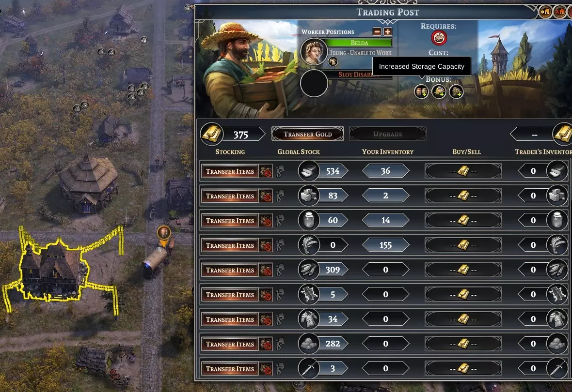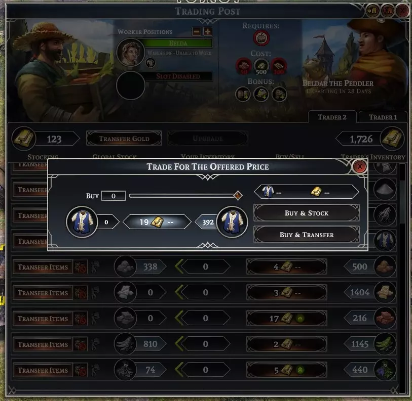 如你所见,我已经把一些物品搬进了建筑里,这样我们就有少量东西可以开始交易了。一开始我们的金币不多,因为我们目前还是一个勉强维持的新兴城镇。 1. 你需要往建筑库存里添加物品才能进行交易。只有当货物存放在贸易站时,你才能达成贸易协议。使用左侧的“转移货物”按钮来移动你想要的物品,并选择数量。等待工人收集物品,根据他们需要走的距离,这可能需要一段时间来为建筑备货。我们可以考虑短期增加第二名工人来提高收集速度,之后再把第二名工人调走。 2. 也要往建筑里转入一笔初始金币,作为启动资金。工人需要再次从你的宝库中取出资源,用于建造建筑。 3 - 商人到来后,你进入交易界面,查看他们的收购和出售清单。我会先尝试出售一些物品来增加初始资金。