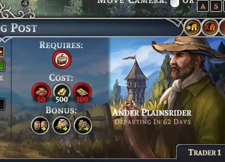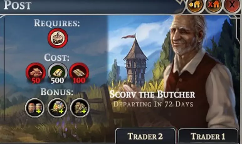 T1建筑 T2建筑 T3建筑 T4建筑 T5建筑 交易 市长先生,我们需要一些重型机器零件来建造风车!我们那些便宜货只会不停地坏掉。我们得找个贸易伙伴来帮忙。 市长先生:不如我们把那边那块地开辟出来,建个贸易站,这样远方的人们就能来卖给我们高价货,让我们心里美滋滋的! 市民:市长先生,这真是个好主意!我们再给您建一座雕像,因为您太聪明了! 在游戏中,总会有需要某种东西来制造另一种东西,但我们自己又无法生产的时候。这时贸易站就派上用场了。每年春天,至少会有2名商人来访,目前已知的商人池中有6名。他们各自携带不同的物品,并会向你购买不同的物品。 当你拥有1级贸易中心后,前4位商人将会出现。 当你将贸易中心升级至2级后,最后2位商人开始出现(可能还有更多我尚未遇到的商人)。最初的4位商人也会继续出现,以满足你的基本需求。 我猜想【市长先生】可以通过这些人的名字来判断他们兜售的商品。