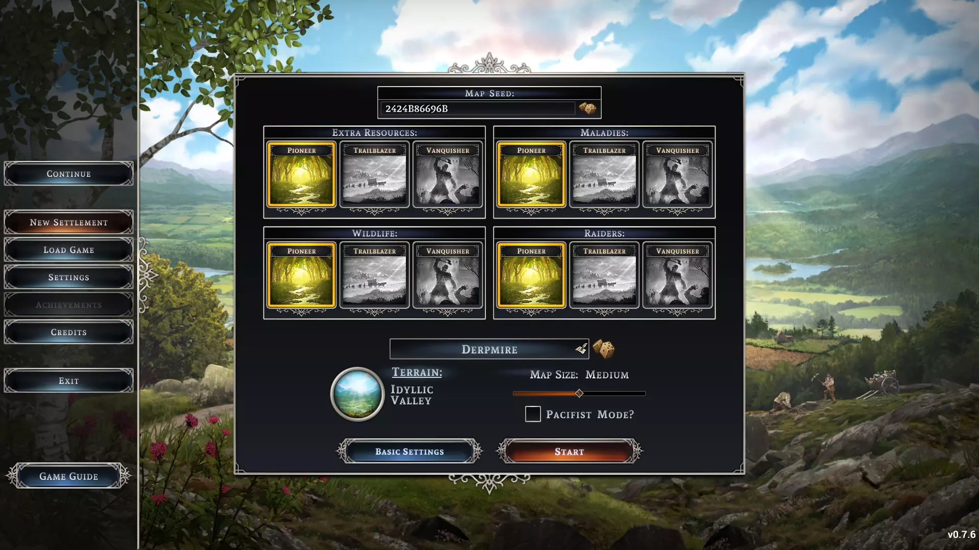 4. 点击你想要进行的交易,然后在买卖界面完成操作。 5. 如果可以的话,在下次商人到来前补充你卖出的任何商品。他们会停留约60天,之后便会前往下一个目的地。 多少食物才足够 我一直在尝试记录每人每月的食物消耗量。 我目前使用【食物生产】界面,因为它将产量、消耗量和腐坏量的指标都集中在一个地方。 我维持64人的稳定人口数年,让各项资源稳定下来,并让农田积累一些肥力。我通常会在每年春天新年界面提示出现时记录数据,持续3年。 暂停游戏,然后将上一年所有消耗的食物(所有类型)加起来。将这个数值除以64(人口数),再除以12(月份数)得到一个数值。将这3年的数值相加并取平均值,即可得到每月的食物量。 我上次进行游戏时,这个数值稳定在每月约3.3单位食物。 目前我的问题是:不同种类的食物是否有不同的营养权重,还是无论食物种类如何,1份食物都等于1份? 游戏设置选项 当你打开游戏时,通过开始【新聚落】,会看到新地图的相关选项。