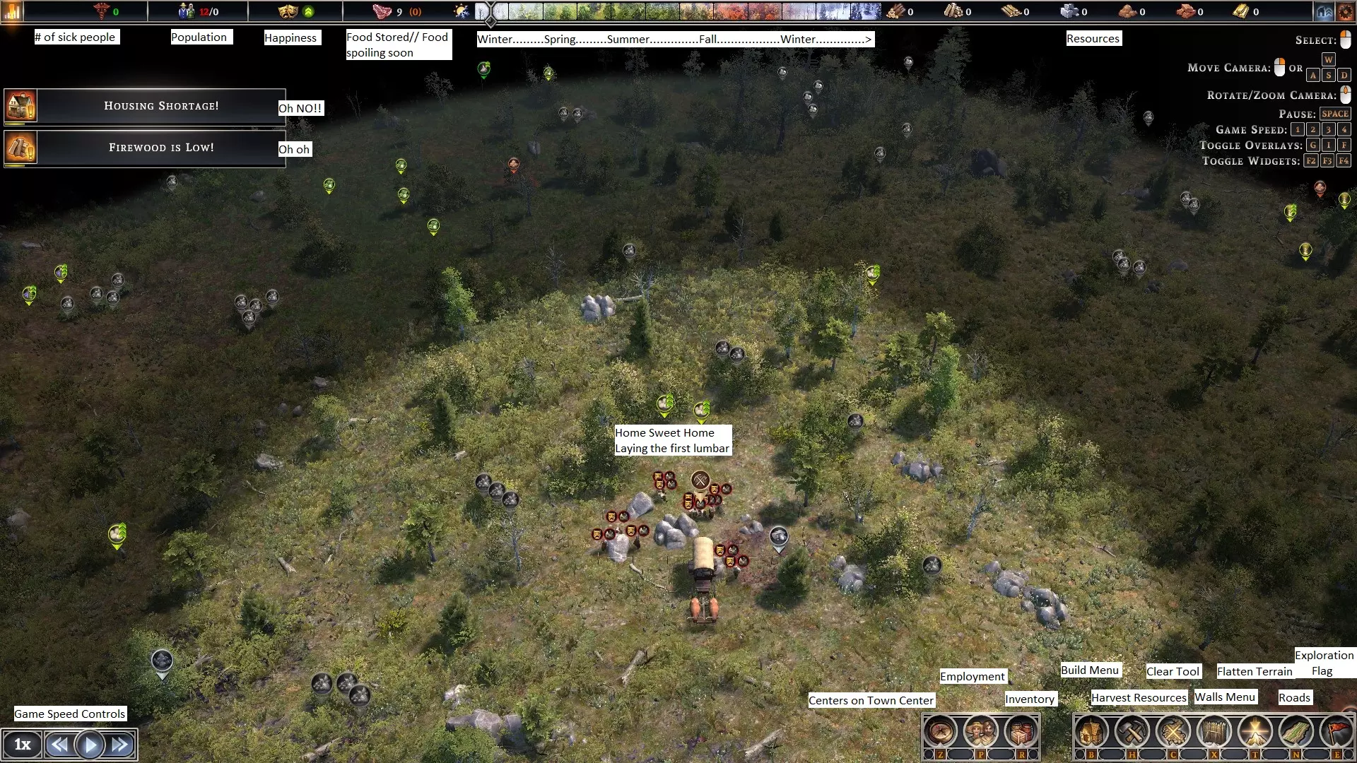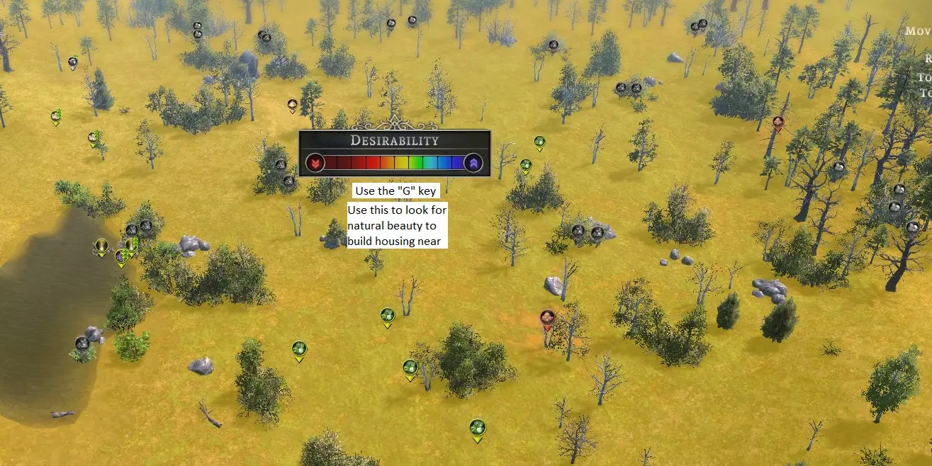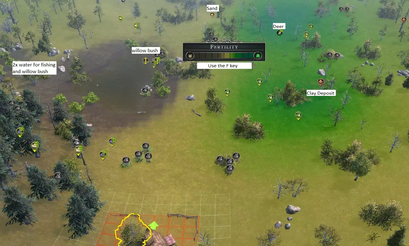 开始游戏:建造城镇中心并选址 游戏开始时,会为你展示一片将作为家园的土地。在你放置城镇中心之前,时间不会流逝。 使用方向键勘察合适的地点。 首先,我们来查看土地肥力,因为许多农场都需要依赖它。按F键调出覆盖层,四处勘察以找到肥力良好的区域,并记住这些地点。