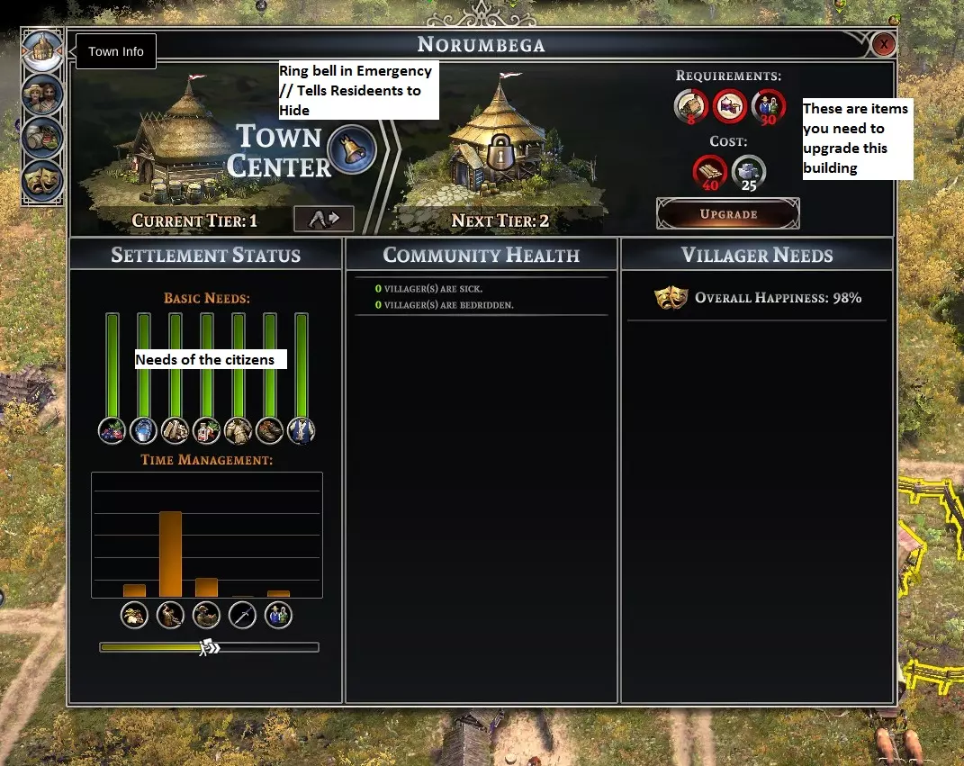 木材与石头 ***重要提示*** 木材和石头系统将进行调整,调整后会补充或修正更多内容。 当前主流玩法是在靠近木材和/或石头资源的区域建造1个工作营地、1个临时住房和1口井(用于生火)。 目前石头资源会耗尽,但未来更新预计将解决此问题。目前已能在地图上找到巨型岩石堆,据观察每个堆包含1200个大型石头。后续还将推出T5建筑。 只要不砍伐某一区域的所有树木,木材会随时间更快再生。建议只砍伐成熟树木或建筑规划区域内的树木。可移动工作营地的作用范围,几年后将其移回原区域使用一个季节,以此实现区域轮换。马车制造商将为临时房屋运送物资(肥皂将在未来更新中加入),这样村民在营地工作时就不必费心处理这些事情——物资会为他们供应。 水系统及其缺失的交互功能: 早期,Crate曾尝试开发一些与水相关的内容,比如桥梁等。他们表示,由于一些未详细说明的困难,与水相关的建筑已被搁置。Zantai(开发者)提到,这部分内容未来很可能会以DLC的形式推出。 漏洞或问题: 目前似乎存在建筑完整性问题。建筑无法得到修复,最终会因损坏而报废。此问题在7.5f版本中已修复。 猎人2级建筑的陷阱数量默认卡在4个。偶尔会出现物品停止移动、劳工或建筑工人四处闲逛的情况。 当建筑停止工作时,使用移动按钮将其拿起并重新放置,即可清除该故障。 等级与建筑要求 游戏的进度基于建筑及其所属的等级。随着市政厅等级的提升,你也会为居民解锁新的建筑和服务。这一点很重要,因为游戏的某些方面(如用于储存的桶)属于中期科技。在你能够建造并运营制桶厂之前,食物会因变质而损耗。 市政厅是一切的中心。从这座建筑开始,我们的帝国将不断发展壮大,直到它让我们的电脑不堪重负并恳求我们停止……不过这都是题外话了……再建一座建筑就好……再建一座建筑,它应该能承受(1帧每秒)……咳咳…… 打开TC界面后,在顶部区域你会看到两个窗口面板。左侧顶部那个看起来像铃铛的是【紧急召回居民警报铃】,另一个窗口面板则显示【升级到下一等级所需的条件】。