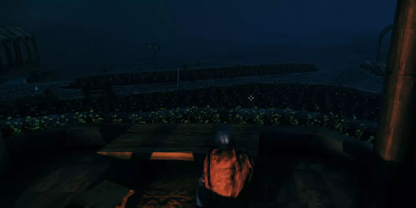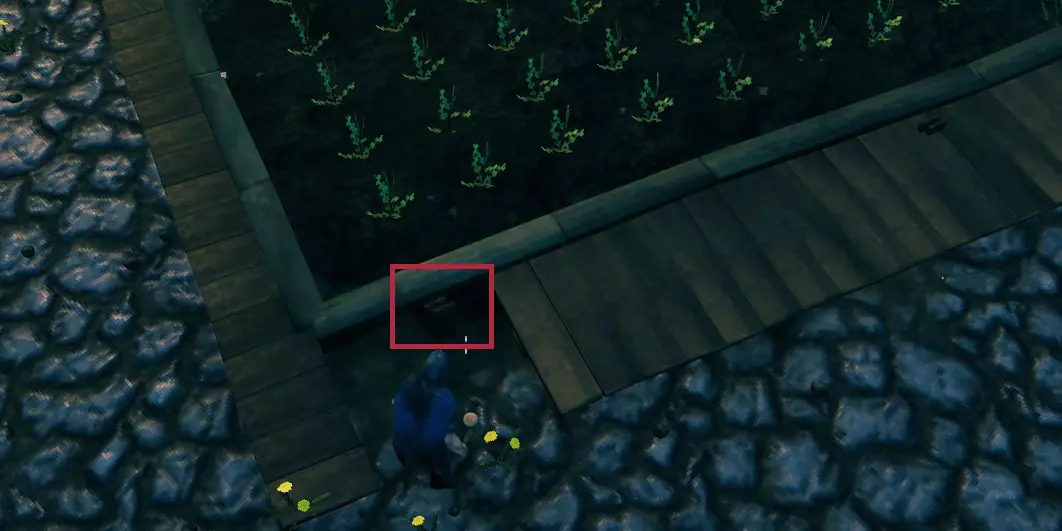 埋藏的工作台 - 外部 我也需要在基地中心设置一些防护,但不想为此专门建造任何东西。于是我在那片小型种植区埋藏了一些工作台,并用几块木地板隐藏了其余部分。注意:不能将物品完全掩埋,否则它会损坏并只会返还木材。必须留下一小部分暴露在外(如果你挖得足够深但无法放置工作台,可以在那里铺一些木地板,然后将工作台放在上面)。