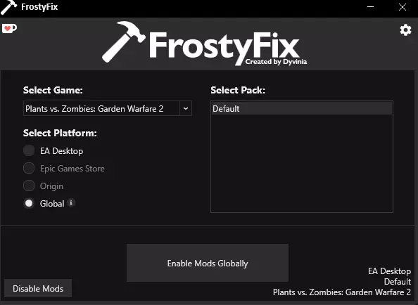 《植物大战僵尸:花园战争2》应该会显示为一个选项,若未显示,请进入设置,在自定义游戏下浏览并选择《植物大战僵尸:花园战争2》。 最后,在主菜单选择【全局】,然后点击【全局启用模组】。如果由于某些原因你不是通过Steam而是通过EA应用程序游玩游戏,只需选择EA桌面端即可。 启动并享受你的模组 点击【全局启用模组】,这会导致Steam在后台关闭。然后,打开《植物大战僵尸:花园战争2》。此时“应该”会加载游戏并激活你应用的模组(前提是你和我在操作及说明过程中均未出错)。