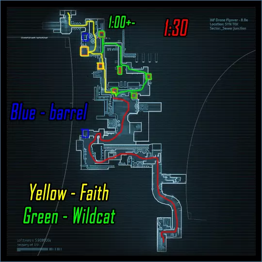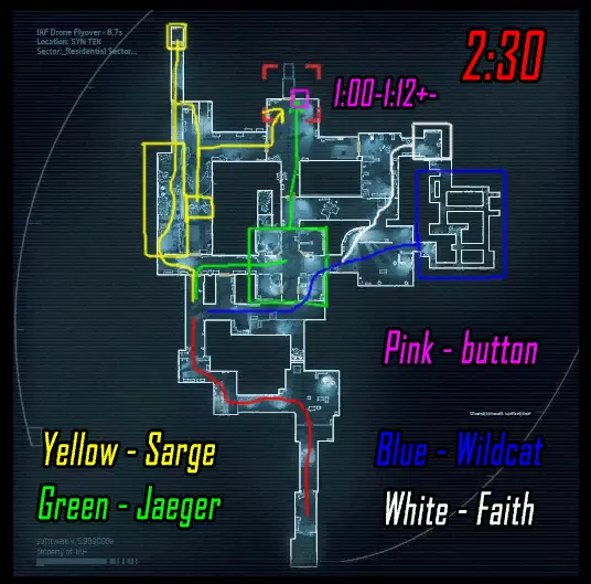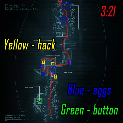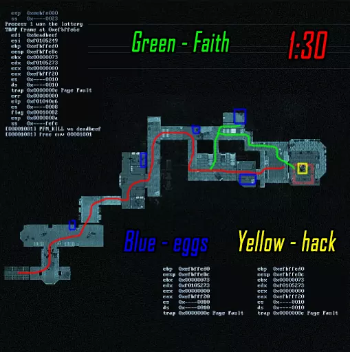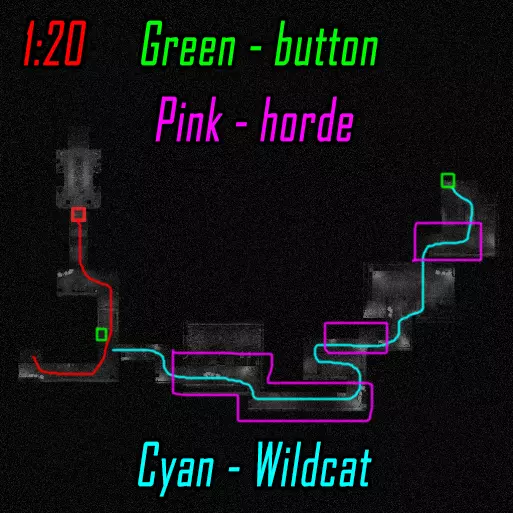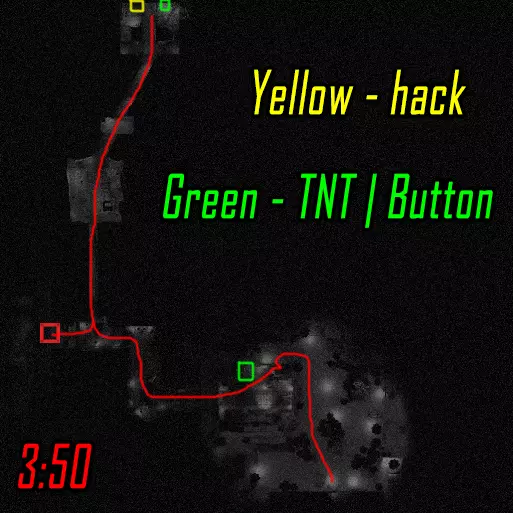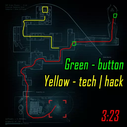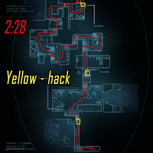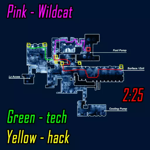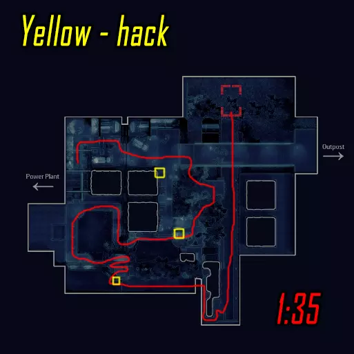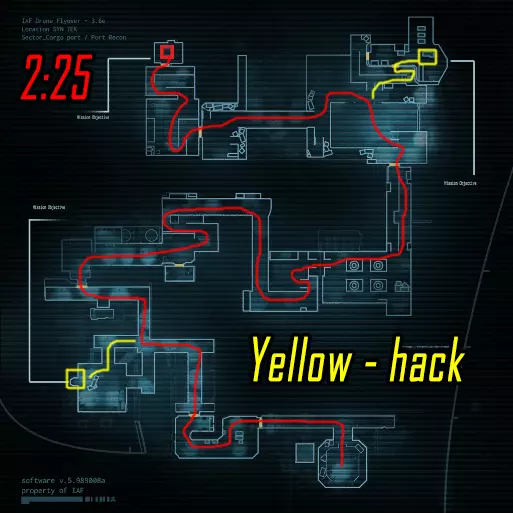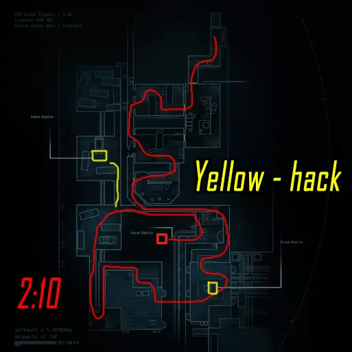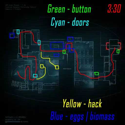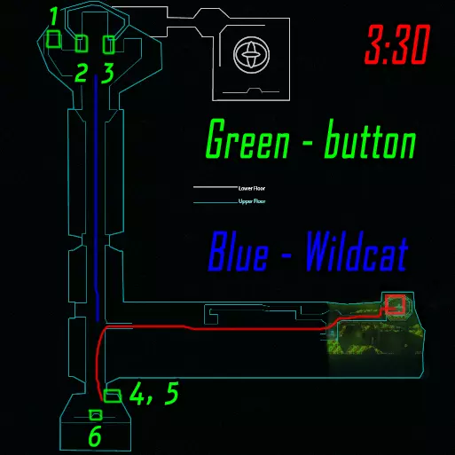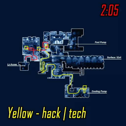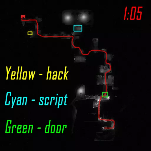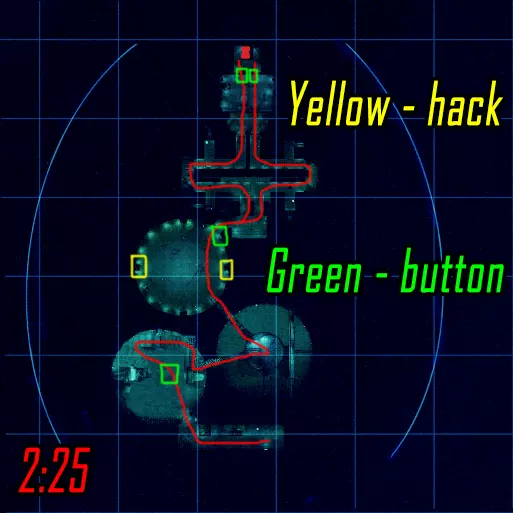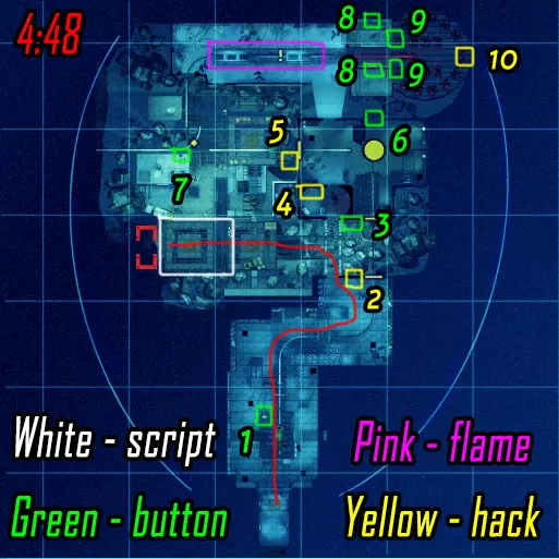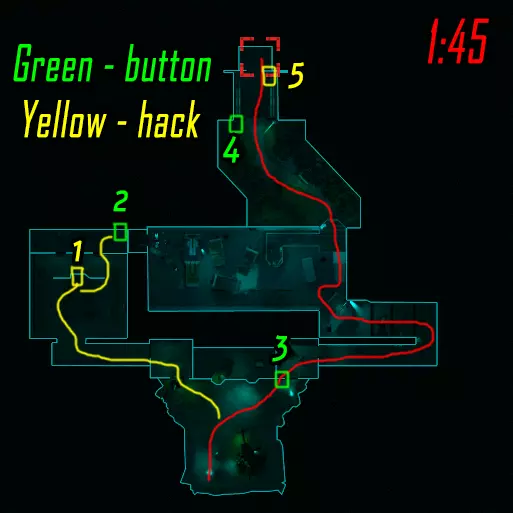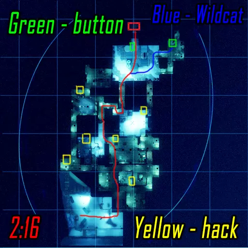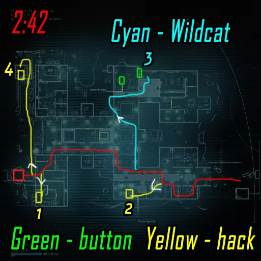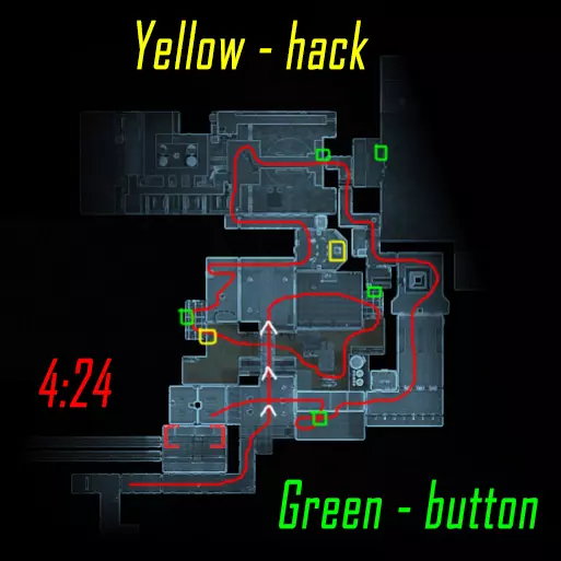 肾上腺素模式下的黑客行动。维加斯跑向远处的终端(数字1),破解后跑向上方的终端(数字4)并等待山猫按下按钮。克雷什最初跑向近处的终端(数字2),破解后跑向撤离区。山猫在第二个终端破解后打开门并按下按钮,之后跑向撤离区。维加斯破解最后一个终端后前往撤离区。