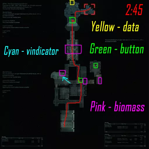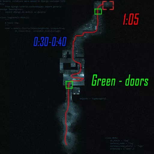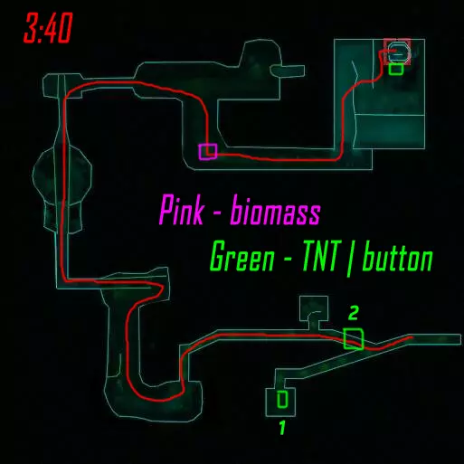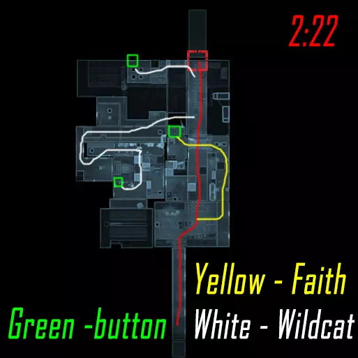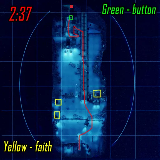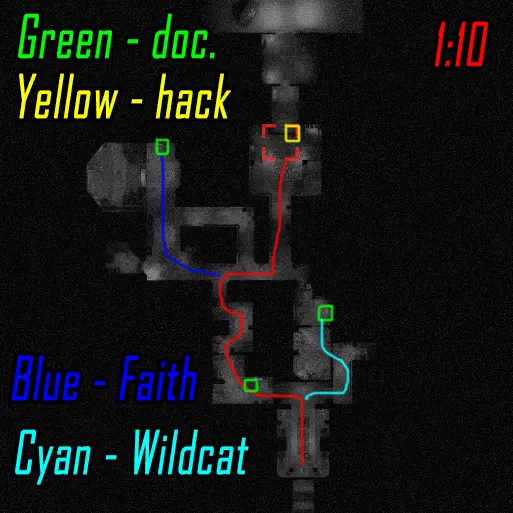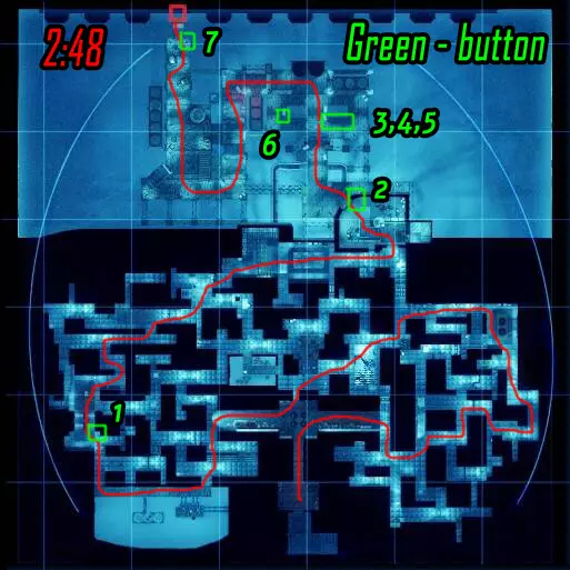 清理第一个区域直至门开启,莉斯( Рысь )跑向远处的按钮,薇拉( Вера )右转并跑向地图中间上方的按钮。按下两个按钮后,莉斯跑向最后一个按钮(按下后不等按钮右侧的门开启就跑向薇拉),薇拉则前往大门处,准备在按下按钮后投掷瓦斯,等待大门开启后进入。