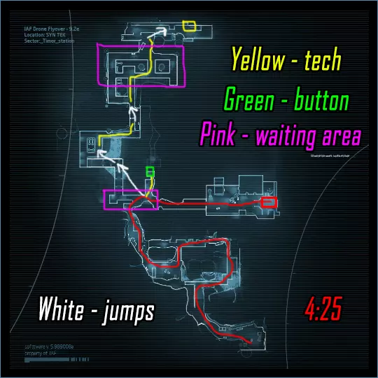 开局后的第一批蜘蛛出现时投掷手榴弹,“山猫”( Рысь)向前跑并打开门。再往前一点,“维加斯”(Вегас)切割石块,然后开门,拿起火箭筒机器人并按照地图所示进行跳跃(可以不等桥梁,但必须按下按钮)。小队的其他成员可以在地图上的某个粉色区域等待载具。完成前两次跳跃后,第三次跳跃到生物量和门之间的空地,以便切割门。在第二组石头中,我们只凿开上面的那块石头,进入右侧的空角落,不要碰那块小石头以免有人碍事,之后再进入。在肾上腺素状态下进行骇客操作,然后跑向飞船。【要让飞船开始下降,整个小队都必须在平台上】