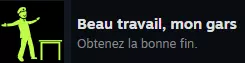 全成就指南。(可能存在一些拼写错误,我是法国人哈哈) -阅读前- 我是法国人,截图都是法语的。我会在各部分中翻译成就。(还可能有一些拼写错误:p) 这也是我的第一篇指南。如果你有任何建议,我很乐意采纳! 关于我的成就,我是通过两次游戏完成的:第一次是为了达成好结局,第二次是为了达成坏结局。两次都需要在战役模式中进行。 First Time, Huh?