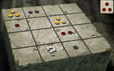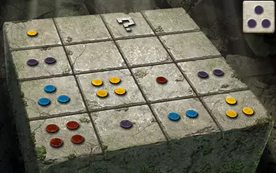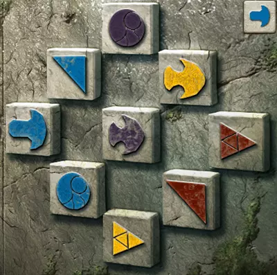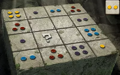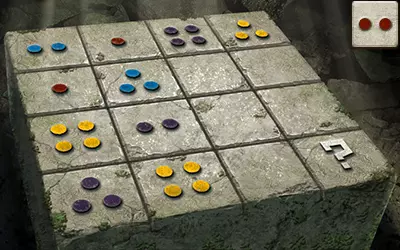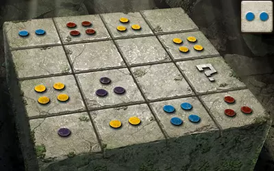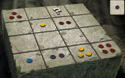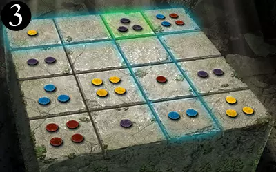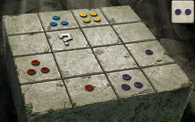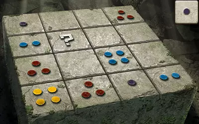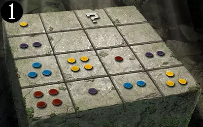 这为我们提供了解决谜题的充分信息:由于问号方块所在的行中有一个带一个点的方块和一个带四个点的方块,且其所在的列中有一个带两个点的方块,因此问号方块上必须有三个点。又因为其所在的列中有蓝色和红色点的方块,且所在的行中有黄色点的方块,所以问号方块上必须有紫色的点。 请注意,游戏中的部分密码谜题看似有多个正确答案,但只有其中一个能获得奖励。 旧日支配者之轮盘