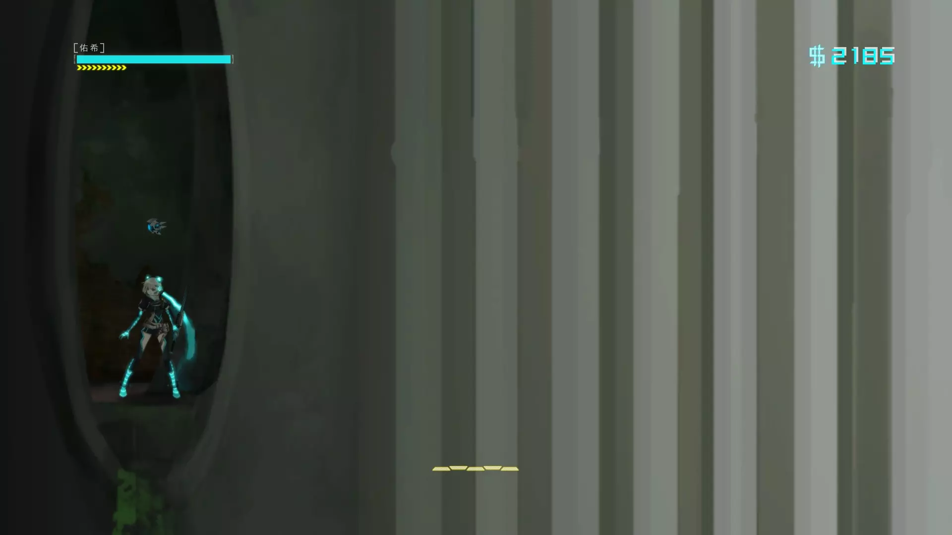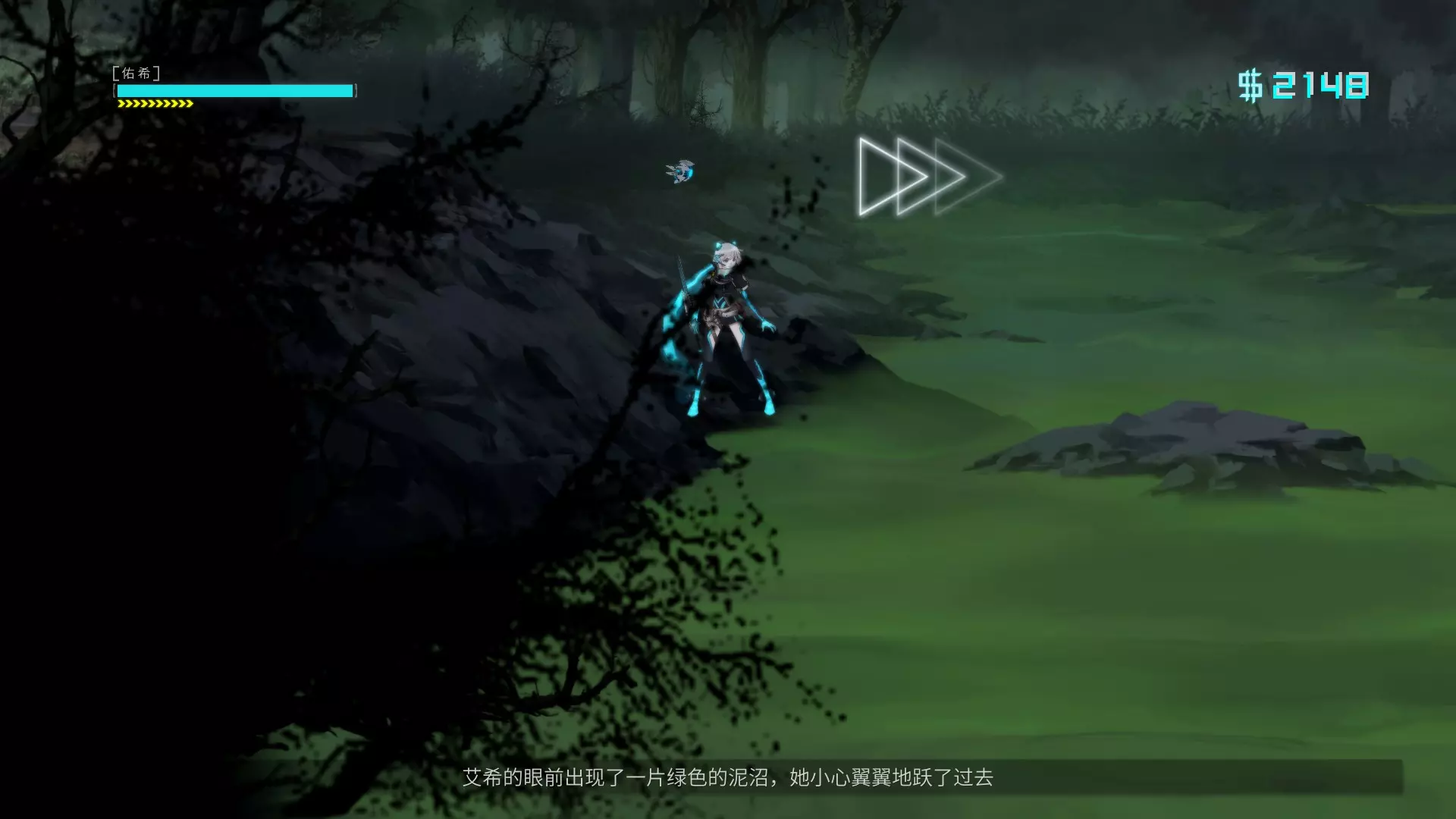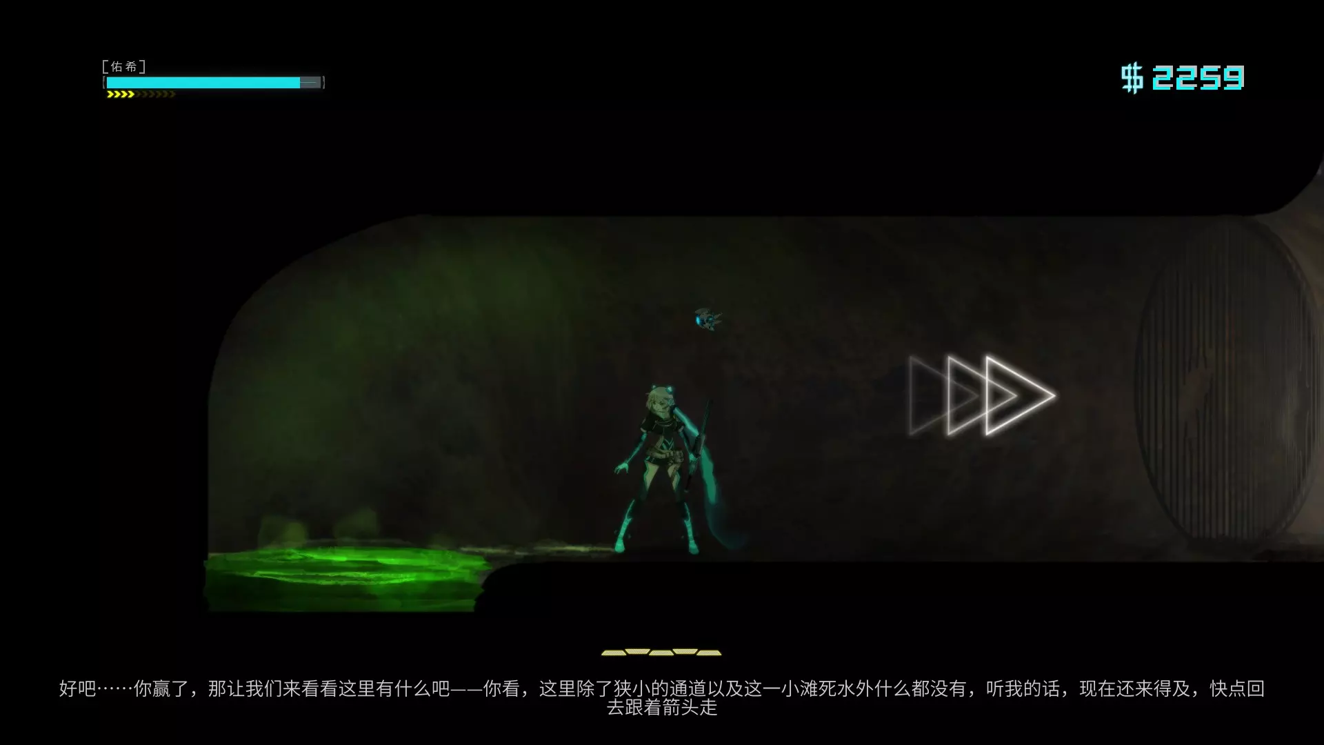 汐 进入【汐】关卡 第五章地铁传送口,依据旁白路径到下图位置,用冲刺往下三次后跳入绿水里可触发