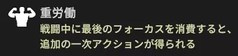重劳动是在战斗中耗尽专注值后,能够额外进行一次行动的技能。 这个build的核心思路是“在一回合内多次发动重劳动进行连续攻击”。 为忙碌的人总结三行(弱化后): 将运气值堆满,购买专注恢复烟斗。 专注攻击→药草→专注攻击→(从此开始看运气)→药草→专注攻击→攻击。 就算运气好,最多也只能攻击4次。 关键组件: 被动技能:重劳动 特性:身轻 专注恢复烟斗 所有药草 首先是重劳动。马丁的初始技能在战斗中耗尽专注值后,会获得+1次行动,从而可以再次攻击。其关键在于只要满足发动条件,一回合内可以发动无数次。 ※弱化后补充:由于弱化,同一回合内每次发动时,发动率都会降低。这相当于对一回合内的发动次数设置了上限。