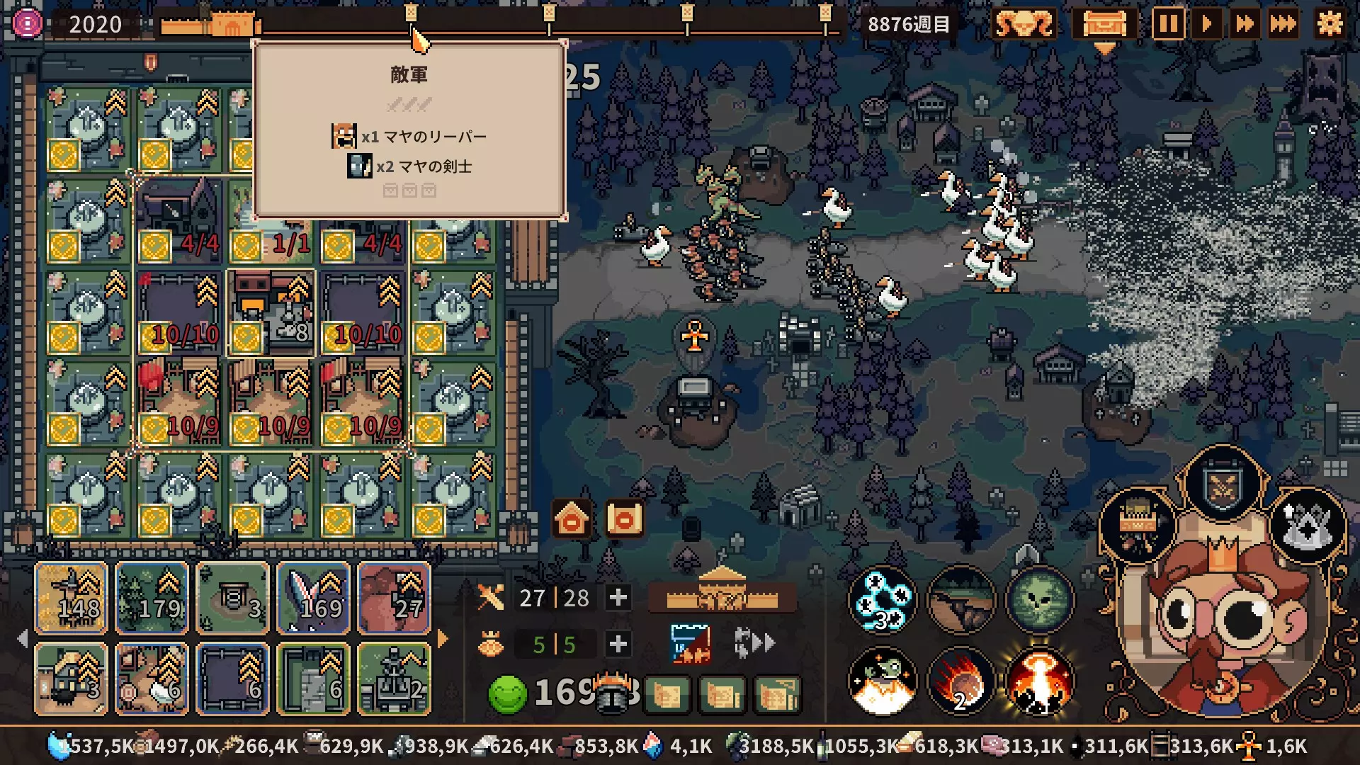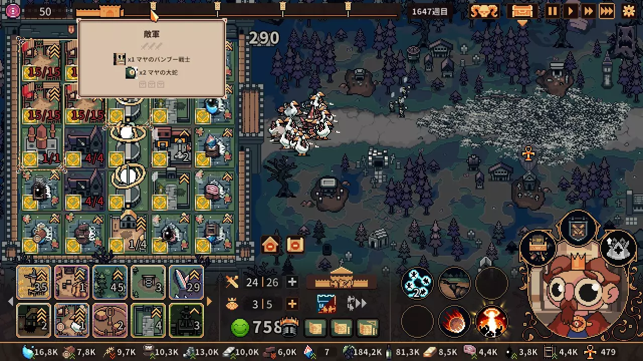 大概在第8900周左右开始第七周目。关于第15500周以后,在实现了单位和资源生产的自动化后,超过第9000周时友方单位的成长已经在一定程度上完成了,之后就稳定为配置大量妖精之泉,视线激活区域则配置单位生产设施的形式。