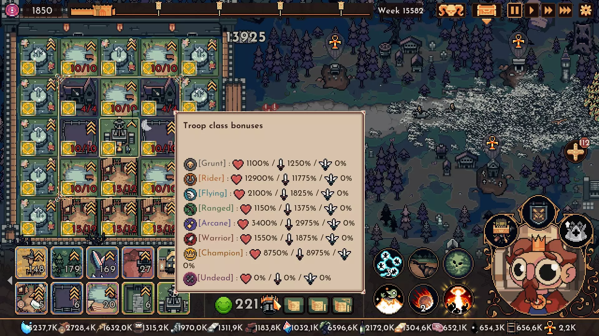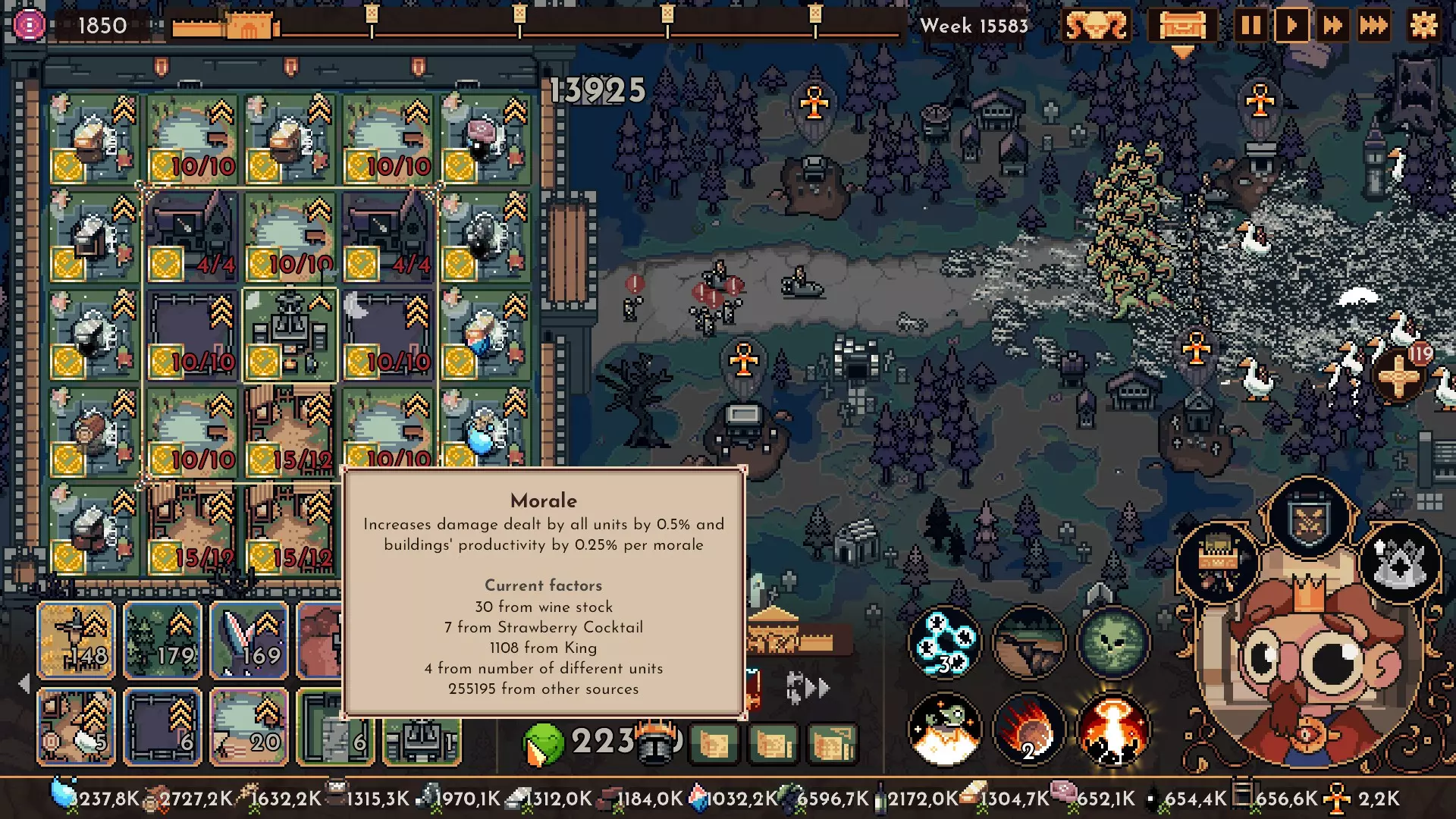 士气已超过255000。 由于士气过高,游戏的运行出现了特殊情况。 该游戏将每秒帧数上限设为60,因此每个资源生产格的最大产出为每秒60次。 此情况与游戏速度无关,所以中断游戏重新开始时,士气的上升速度同样为每秒60。 当士气为3000时,需要现实世界时间50秒。各生产设施的资源生产速度也会受到每秒帧数60上限的影响,因此士气25万时的1倍速生产速度已经达到上限,即便调整为3倍速,也只是加快游戏内时间的流逝,以游戏内时间为基准,资源生产速度相比1倍速会相对下降,这一点需要注意。 达到第9000周大约需要现实时间50小时,从第9000周到第12000周约需40小时,到第15500周约需20小时,期间只需启动游戏并放置即可。 这是由于敌人波次到达时出现严重的掉帧问题。 建议大家不妨挑战一下,第3000周之前其实意外地轻松。
