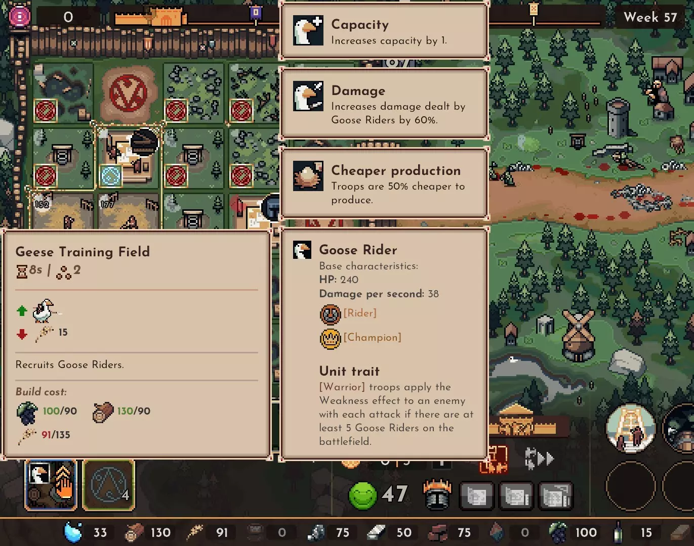 鸭子训练场的建造需要消耗葡萄,但仅用小麦即可进行生产。请注意这一点,在1号首领阶段可建造2处,2号首领阶段可建造4处,3号首领阶段可建造5处,这样就能满足需求。