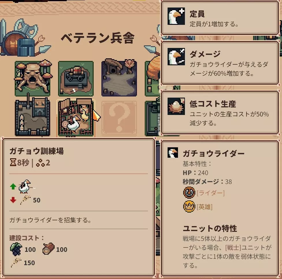 安贝尔 潘瑟 苏菲 胡子老爹 石魔像 使用弗兰奇贤王雷欧,采用了这个顾问配置。 经理在本攻略中并非必需。 弗兰奇虽然有少许可替换的余地,但为了在初期获得鸭子训练场而采用。 单位·设施 挑选并介绍本攻略中具有特色的设施 鸭子骑士