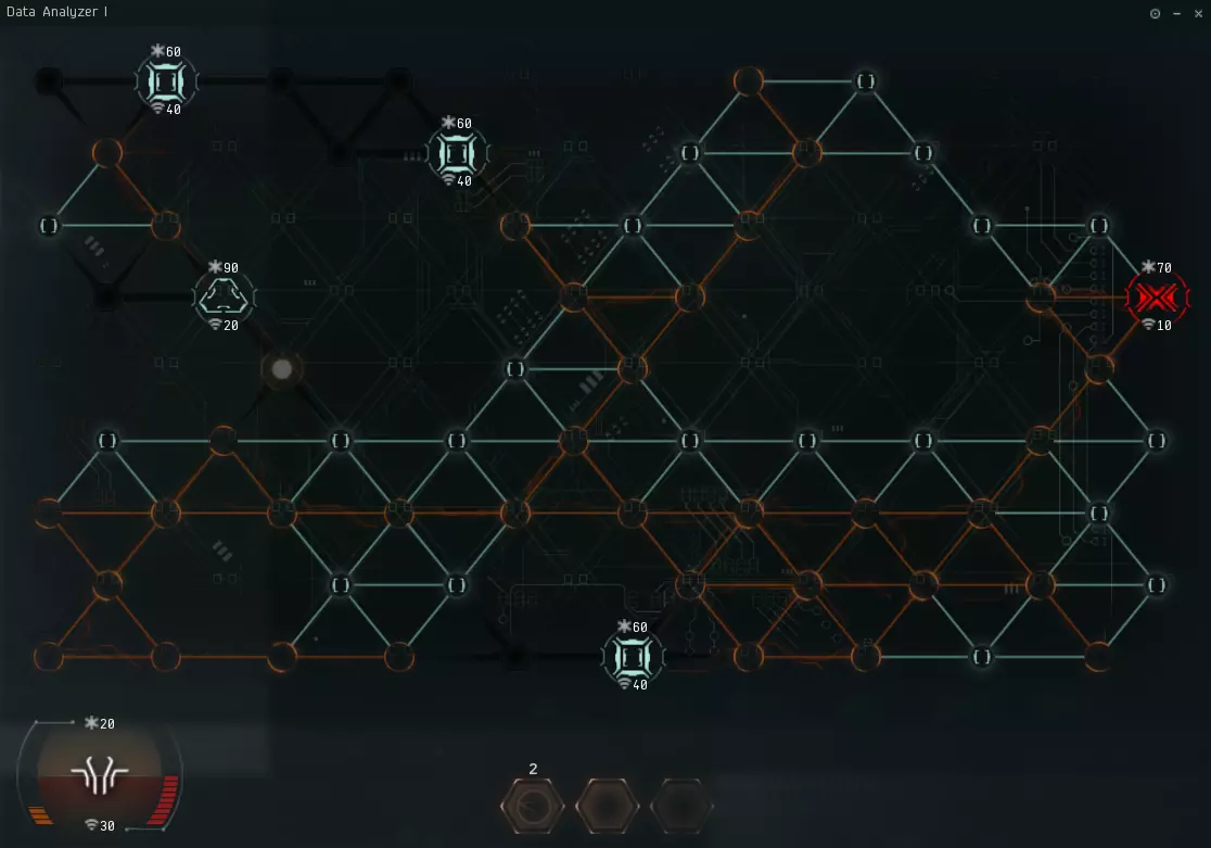锁定(快捷键:Ctrl + 左键)特定宝箱之后,在有效距离内使用遗物分析仪或数据分析仪就会进入破解系统画面。破解宝箱的过程是一个类似扫雷的小游戏,玩家操控病毒,在宝箱的防护系统当中探索,只要破坏系统核心就算破解成功;病毒耐久度归零、或是破解画面被关闭,就算破解失败。通常高安的宝箱破解难度较低,低安、零安、虫洞的破解难度会越来越高。 空贼的资料/遗迹如果连续两次破解失败,会在短暂延迟后爆炸并自我毁灭,但这种爆炸对玩家的船只不会造成伤害。注意!某些特殊地点的资料/遗迹破解失败后会造成伤害或惩罚(例如:休眠缓存),请新玩家多加留意。 ▼橘线是玩家探索过的路径,绿线是玩家未探索过的路径