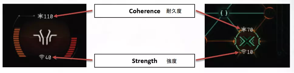 玩家的病毒/敌方的防卫系统具有两种数值: 强度:攻击力,每次攻击/反击所造成的伤害。 耐久度:血量,能够承受的伤害量。