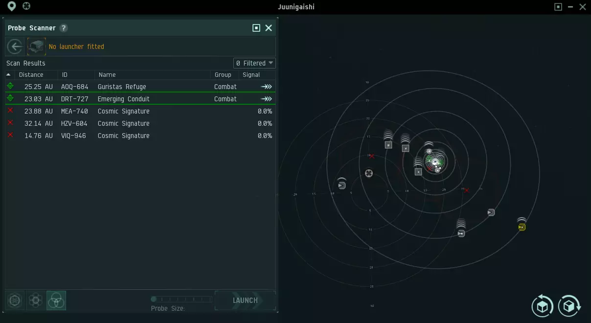 宇宙异常点(Cosmic anomaly)这些地点不需要发射探针扫描,只要点开扫描地图就能看到位置,随时可以直接右键飞过去,包括战斗地点和采矿地点。本文不讨论战斗和采矿,因此异常点非本文重点。 宇宙信号点(Cosmic signature)需要发射探针扫描才能显露精确位置,获得位置后才能飞过去的地点: 战斗地点(Combat site):包含一些有敌意的NPC(非本文重点)。 气矿地点(Gas site):包含可以采集的气体云(非本文重点)。 遗迹地点(Relic site):包含一些遗迹物件,需使用遗迹分析仪(Relic Analyzer)才能破解。 数据地点(Data site):包含一些数据物件,需使用数据分析仪(Data Analyzer)才能破解。虫洞(Wormhole):通往各种区域的捷径,也可能通往虫洞空间(W-Space)。 探索的步骤 首先,把扫描探针装入探针发射器当中,一次可以装8枚。建议新玩家同种探针一次买16枚,这样每次发射出8枚之后,发射器会自动装填剩下的8枚,玩家之后就不需要手动装填了。 再来就是发射探针,可以直接点屏幕下方的发射器图标、也可以在扫描界面点【发射】按钮。要注意在建筑物内、或是在跃迁(warp)及隐身(cloak)的时候,发射器是不能用的。在扫描地图上,探针呈现为淡蓝色的球状物,表示探针的位置及扫描范围。