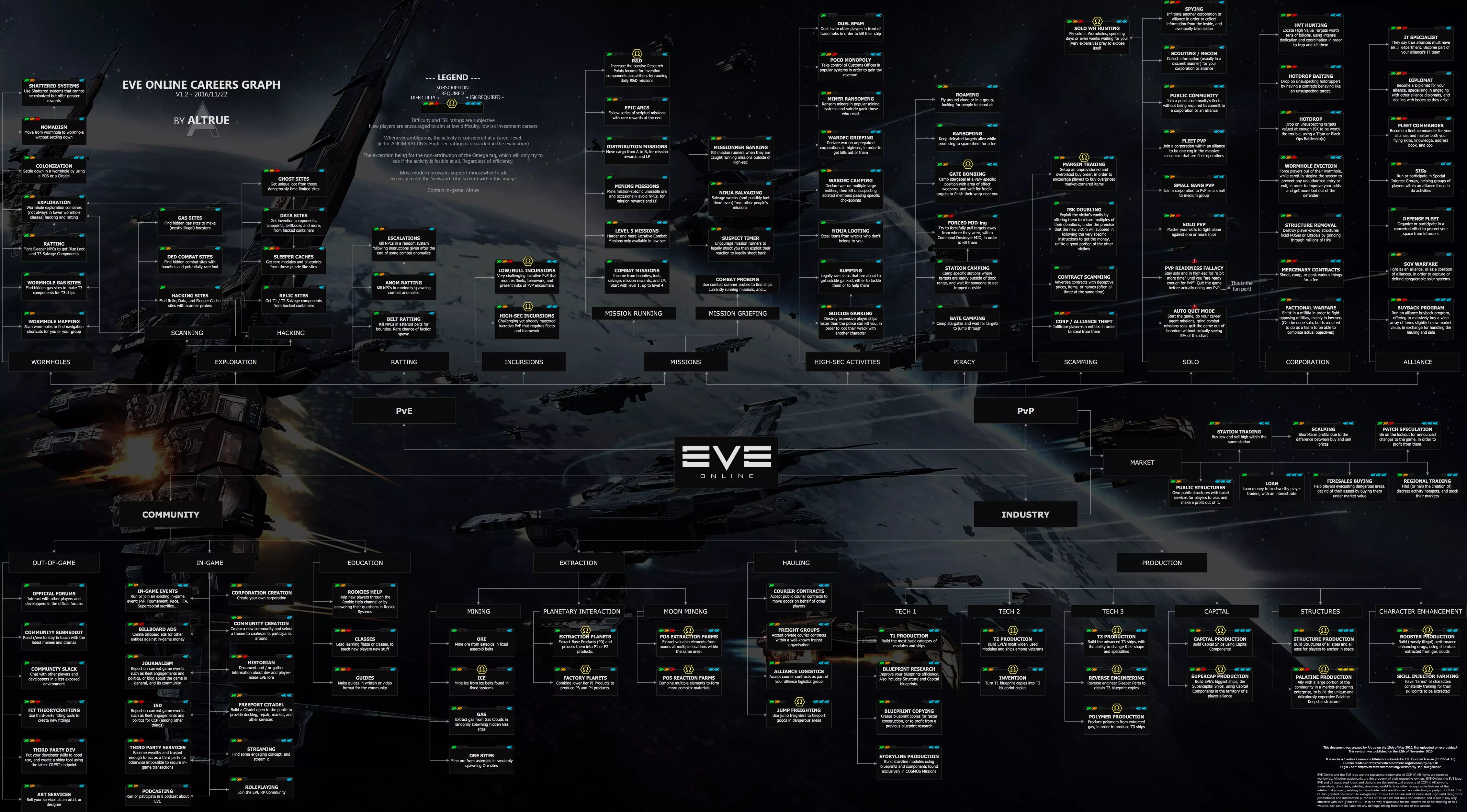 《星战前夜》是一款自由度极高、以活跃的玩家经济活动著称的太空科幻MMORPG,自2003年运营至今,算是当今最长青的线上游戏之一。虽然是老游戏,但游戏美术及UI都有随时间演进,以今日的标准来看仍然相当精致。玩家驾驶太空船在千百个星系之间穿梭,进行采矿、探索、制造、贸易、物流、战斗、偷抢拐骗等各种活动。 EVE的玩家有很多可能的职涯选择,下图为各种职涯方向及难度粗估(by Altrue)