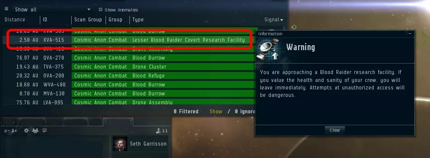 如果没有设定任何过滤条件,所有种类的物件都会显示在D-Scan(定向扫描)界面上。对于在虫洞探索的玩家而言,启用D-Scan内置的PvP过滤条件,能更好地筛选出重要物件;玩家之后可以自行研究EVE University提供的过滤条件设置教学,根据情境自定义自己的过滤条件。最需要注意的物件包括:其他玩家的飞船、扫描探针、无人机、残骸等。这些物件的存在,可能意味着这个虫洞空间近期有其他玩家的行踪。这里要请新玩家特别留意:D-Scan扫描不到隐形的飞船。富有经验的猎人在虫洞狩猎探索者时,常会驾驶有隐秘行动隐形模块的飞船,像是阿斯特罗或斯特拉提斯。因此,即使D扫描(D-Scan)界面一片空白,也无法百分之百断定这个空间是安全的。 ▼被隐形的猎人突袭示意图