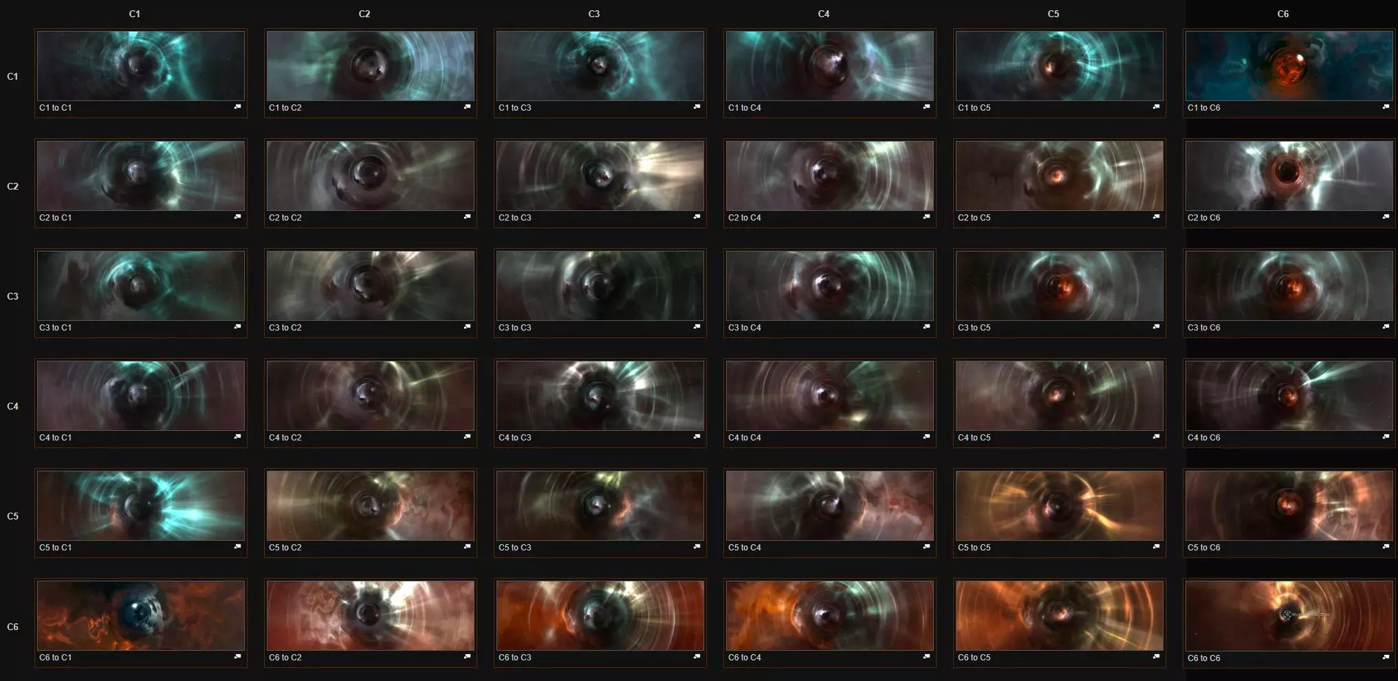 虫洞是暂时出现在宇宙中的捷径,可能通往远方的星系,也可能通往虫洞空间(W-Space),必须通过扫描才会显现在地图上。虫洞空间中有强大的NPC、珍贵的矿物,也有许多高获利的遗迹/资料地点,是一片星际警察CONCORD不介入的无法地带。虫洞的探索有很多学问,本文受限于篇幅,只能介绍一些对新玩家而言最重要的面向。不过,即使不打算在虫洞探索,由于虫洞可以让玩家快速往返高安与零安之间,借此避开被守在星门的猎人(camper)突袭的风险,因此建议新玩家稍微了解一下虫洞的运作方式。 虫洞种类