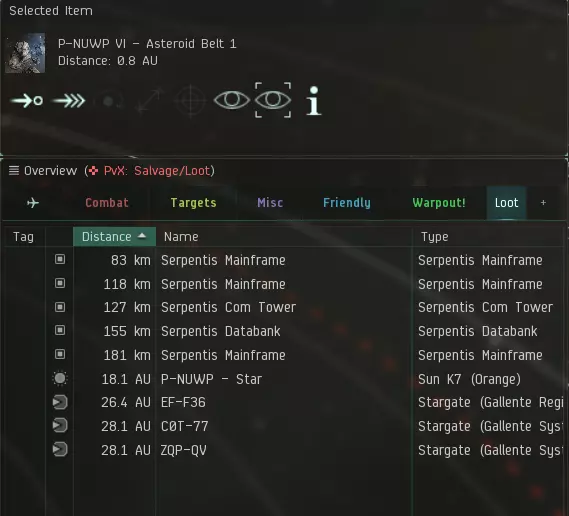 首先要注意的是,在高安、低安、零安星系时,玩家可以通过观察本地聊天室的人数,得知目前所在的星系中有几个在线玩家。但是,虫洞空间的本地聊天室中,除非有人主动说话,否则不会显示玩家数量及ID。换言之,玩家永远无法确定当前虫洞空间中有多少人;看似静谧的星空中,可能潜藏着准备狩猎探索者的其他玩家。在零安探索时,若本地聊天室只有自己,基本上十分安全,可以放松心情探索;在虫洞当中,玩家无时无刻都要保持警戒,一旦心态松懈,很容易会被突袭个措手不及。 由于没有聊天室的辅助,方位扫描(Directional Scan,简称D-Scan)变成虫洞探索玩家至关重要的保命符。所有飞船(包括逃生艇)都有内置D-Scan功能。D-Scan类似于雷达,玩家以自身飞船为中心,指定雷达扫描的角度、距离、方向,每次扫描只需要约半秒的时间,且可以不断重复扫描。D-Scan界面会显示扫描范围内的各种物件,它就像是探索玩家的眼睛,帮助玩家发现一定距离内的各种潜在威胁源。 正确地使用D-Scan也是一门学问,本文这边只给新玩家一个简单的建议:把D-Scan的扫描角度设为360度(全方位),把扫描距离设为最大值14.3 AU。一旦进入虫洞空间,就开始不停地按D-Scan快捷键(默认V)扫描。从事探索的同时,眼睛也要时不时地确认D-Scan有没有扫到什么可疑的物件。 虫洞旅人的日常