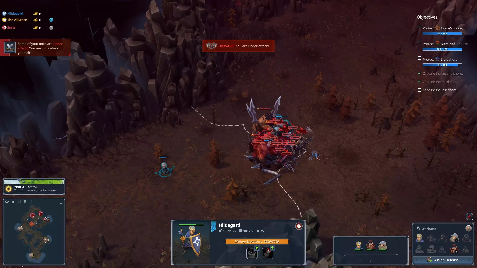 This guide provides tips and tricks on how to beat chapter #10 Nermoster of the Cross of Vidar story on difficulty setting EXTREME. Introduction Many people in steam discussions claim, that chapter #10 Nermoster of the Cross of Vidar story is bugged (since ~02/2023). Actually it is not bugged, it is just difficult, extremely difficult (as the difficulty setting states). On normal setting the chapter is rather easy. On EXTREME setting, phase 2 after liberating all shores spawns 2 Draconic Jötuns with a small fellowship for each of the 4 gates of muspell located on the map. Thes waves walk towards your liberated shores and those cannot stand the attack at all. If one wave reaches on of your shores unharmed, you have lost. And on top these waves spawn VERY frequently. Here are some tips on how to beat it on EXTREME. It is a lot of fun challenging this chapter and finding a way to beat it. So I recommend to first try on your on and be creative. Once you don't make any progress any more and only want to smash your computer into pieces and never play Northgard again due to this damn chapter 10 - take a look at this guide. Hope it helps ;-) Phase 1 - Liberating shores In the first phase you need to liberate 3 shores from occupying enemy troops. You will receive reinforcements regularly to grow your army. Other enemy zones spawn waves regulary to attack your liberated shores. Use your troops with micromanagement, retreat wounded units and heal them regularly in your liberated shores. (Healing is super fast in this chapter) Make sure to avoid loosing any troops - you will desperately need them later on. Spam the hero abilites (Light of Idavoll / Ice Sword) during fights and REMEMBER to upgrade the skills once enough experience is available (I only noticed this has to be done manually at the end of the chapter...) Take out one enemy zone at a time, liberate the shore last. Liberate the shore only after all other enemy zones have been cleared - otherwise you will end up with too many enemy zones when liberating the next shore. When liberating a shore, clear all troops and damage the tower to be burning, but retreat before it is finished and the zone is captured. Send your troops back to an already liberated shore, heal them, position them at the front to the next story section and use one unit to finally liberate the cleared shore. This way you start into the battle for the next shore with fully healed units.Especially when liberating the 3rd (last) shore, make sure you HEAL your units (see hint 6.). Also make sure to upgrade all hero skills if enough experience is available. Especiall Wrath of Vali (Blood sword) should be available now and at least on level 2 (one star). Finally liberate the last shore and move on to phase 2 with a fully healed army. Phase 2 - Gates of Muspell This is the hardest phase of all 4 phases - and seen as bugged / unbeatable in some discussions on steam. TL;DR - Summary phase 2 Wrath of Vali (Blood sword) is key, just ignore Light of Idavoll (Frost Sword) Cluster waves together with micromanagement move Take out clustered waves with AOE damage Approach and take out each gate one by one Heal between waves The situationNew areas are revealed after liberating the 3rd shore with 4 Gates of Muspell zones and one final shore to be liberated. Each zone will send 2 Draconic Jötuns and a small fellowship towards your liberated shores. The shores cannot defend themselves and will be conquered by one wave only, so we need to support them / stop the waves before. Normal vs EXTREME difficultyOn normal difficulty you can directly rush the shore and enter phase 3. On EXTREME difficulty you will have to clear each and every single gate (see quick and lucky way for an alternative) to reach the shore zone and you will be busy for the next ~5 minutes every single second with alot of micromanagement. How to start phase 2You will start phase 2 with a fully healed army (if not re-check the hints to phase 1). Make sure to send Hildegard to support Liv and her shore directly. Wait until all units of the wave approaching from the western gate reached the shore and use Wrath of Vali (Blood sword) to kill it quickly using the heavy area of effect (AOE) damage. Meanwhile (yes in parallel to the fight in Liv's shore) move a part of your army (at least one unit) two zones east of Liv's shore (south-east of the western gate, at the entry of the "mountain valley"). All waves from the other gates will pass through this zone on their way to the other shores. How to cluster wavesYou will use the following micromanagement move to stop them in this zone and cluster them together. Micromanagement Once a wave of enemy units enters a zone with one of your units present, they will attack it. If you move your unit out of the zone before it is killed, the enemies will "celebrate" their "victory" with a short animation (~1.5sec). Make abundant use of it by moving in - out - in - out - ... - out of the zone until all incoming waves reached the zone and are ideally clustered all together. Now send the rest of your army in, especially with Hildegard and use Wrath of Vali (Blood sword). You will kill the wave rather quickly with the AOE damage, hence key is to have all waves clustered together. Enemy units celebration