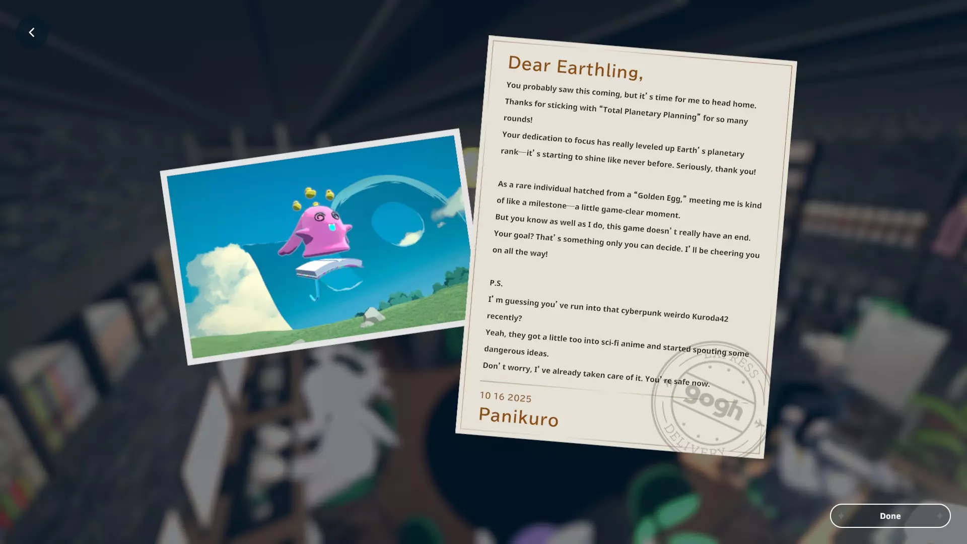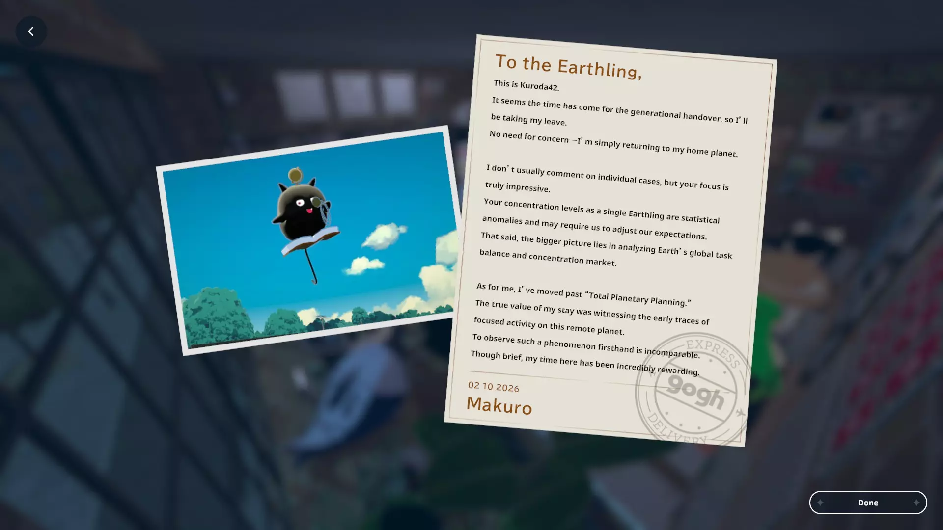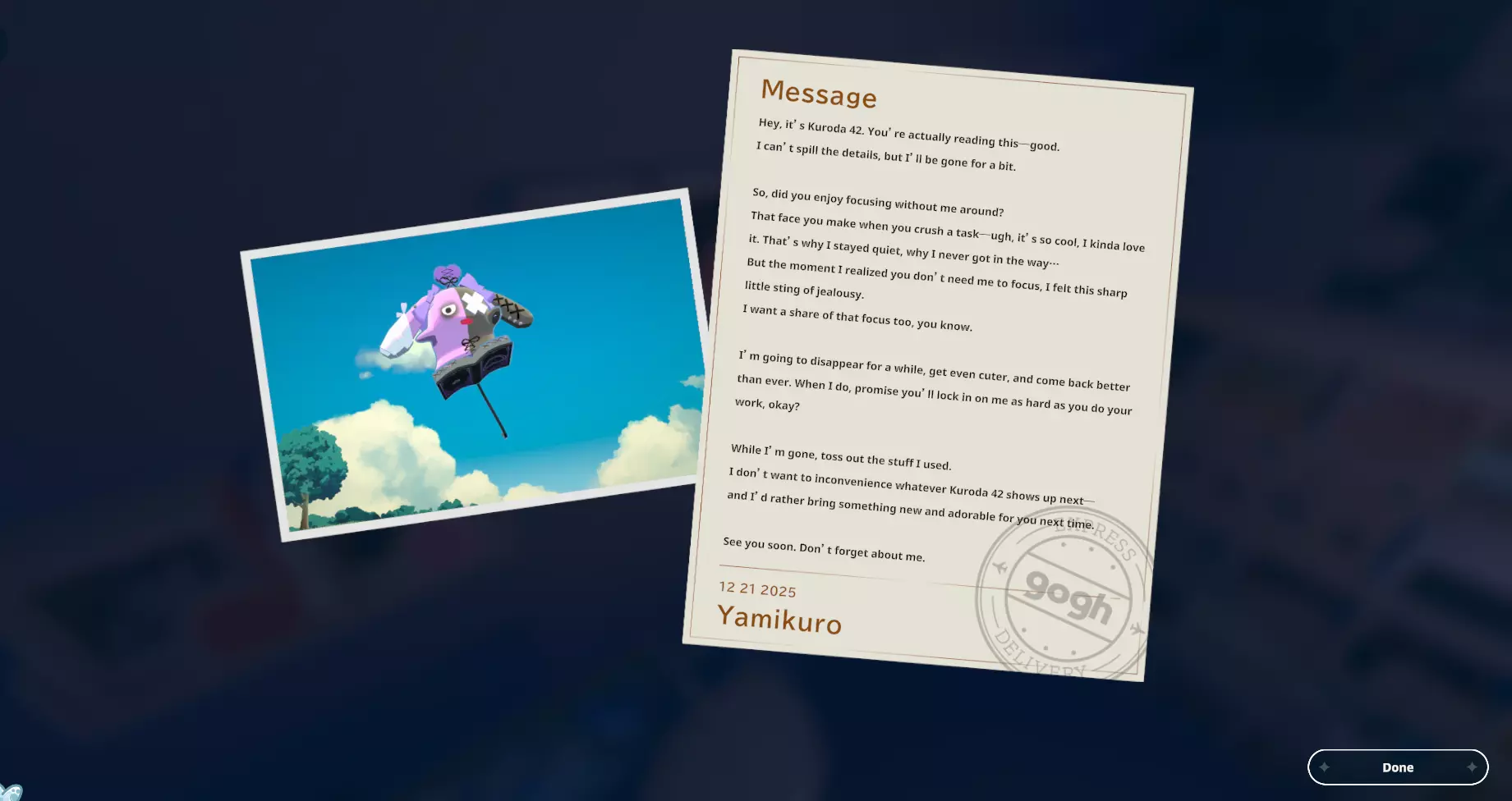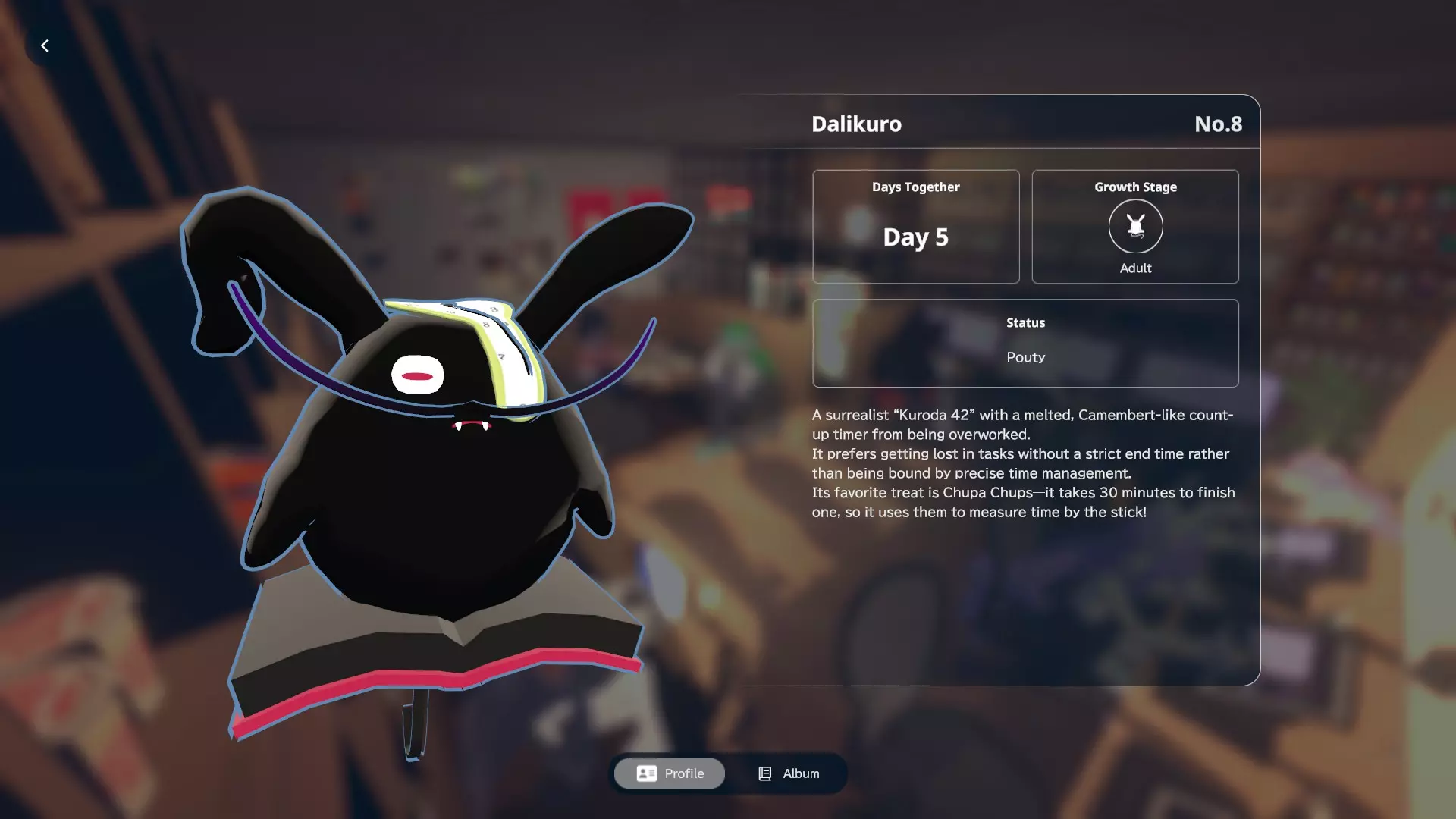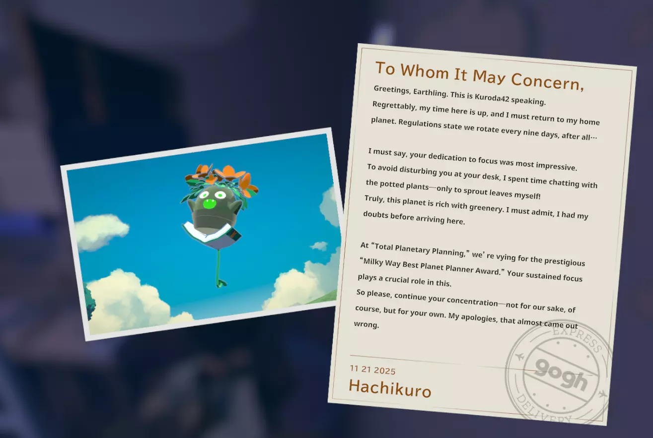 我个人关于如何获取黑田24不同形态的笔记 黑田42概述 在电子游戏《gogh: Focus with Your Avatar》中,黑田42是一种神秘生物,玩家可以在工作时实时养育并观察它成长。 以下是官方网站上对黑田42的描述: 引用自《gogh: Focus with Your Avatar》:这个自称来自神秘“g”陨石的“全行星规划师”的古怪外星人,会与容易分心的人一同降临,以帮助他们集中注意力——至少它是这么认为的。它发自内心的建议往往显得滑稽地偏离目标,但嘿,它尽力了。生命周期 进化日 蛋 第1天 幼崽 第1天 孩童 第2天 成年 第5天 毕业 第10天 黑田42列表 蛋 神秘蛋 金蛋 幼崽 豆黑 孩童 噗尼黑 超酷黑 丸黑 咩咩黑 咪咪黑 波瓦黑 成年 邦克黑 咖啡黑 达利黑 多库黑 福袋黑 八咫黑 闪亮黑 桑名黑 女仆黑 马克黑 真黑 奇迹黑 星云黑 牛奶黑 猫咪黑 面包黑 飞弹黑 宇宙黑 暗黑黑 梦境黑 幽灵 【蛋】神秘蛋