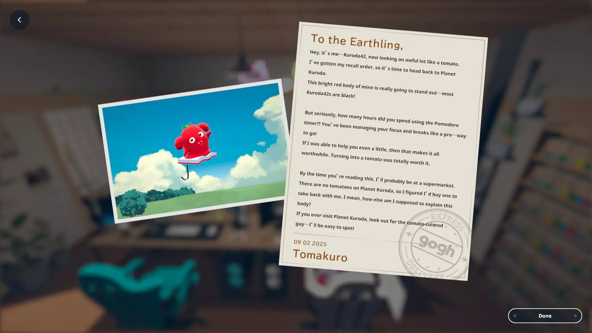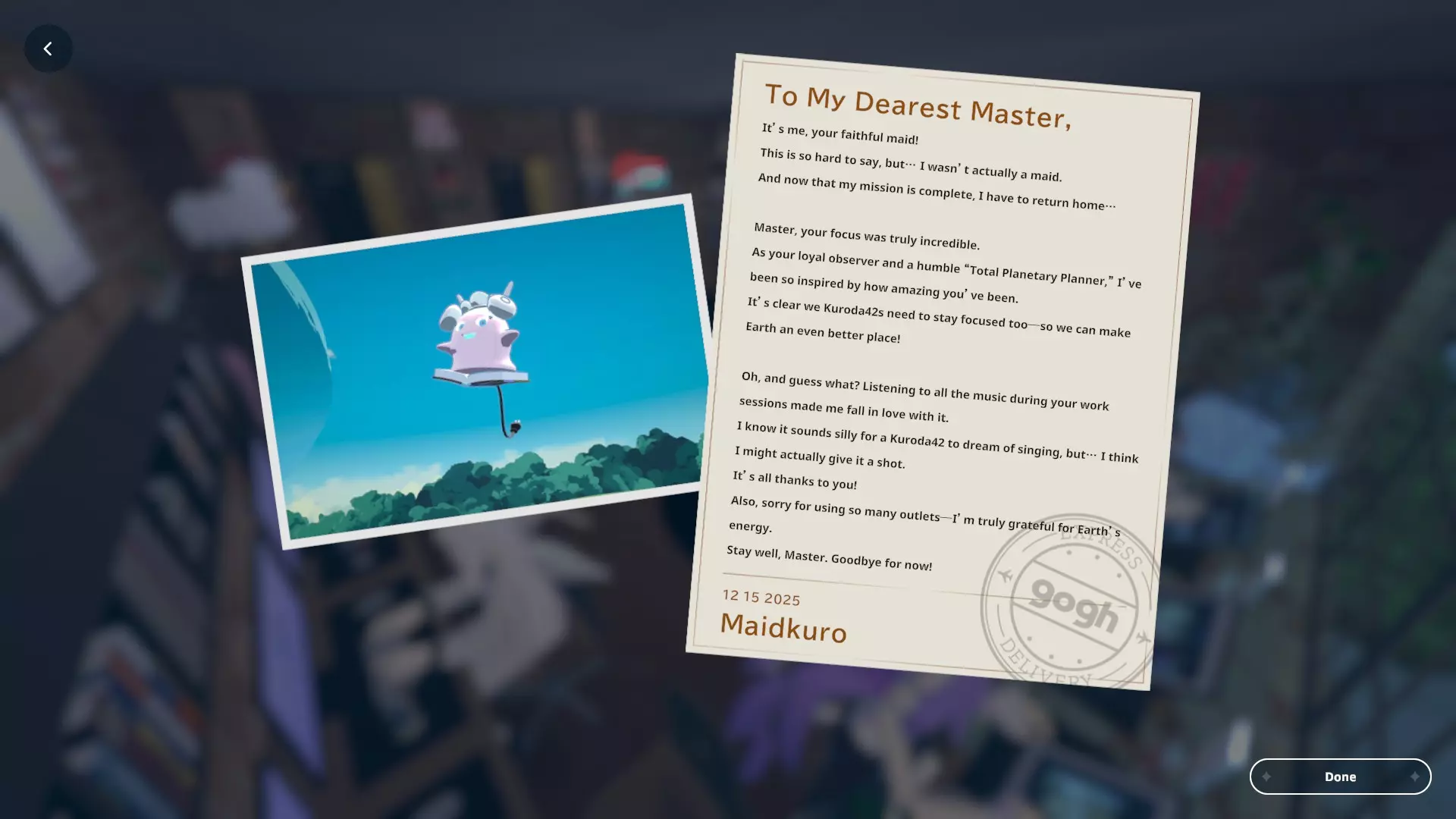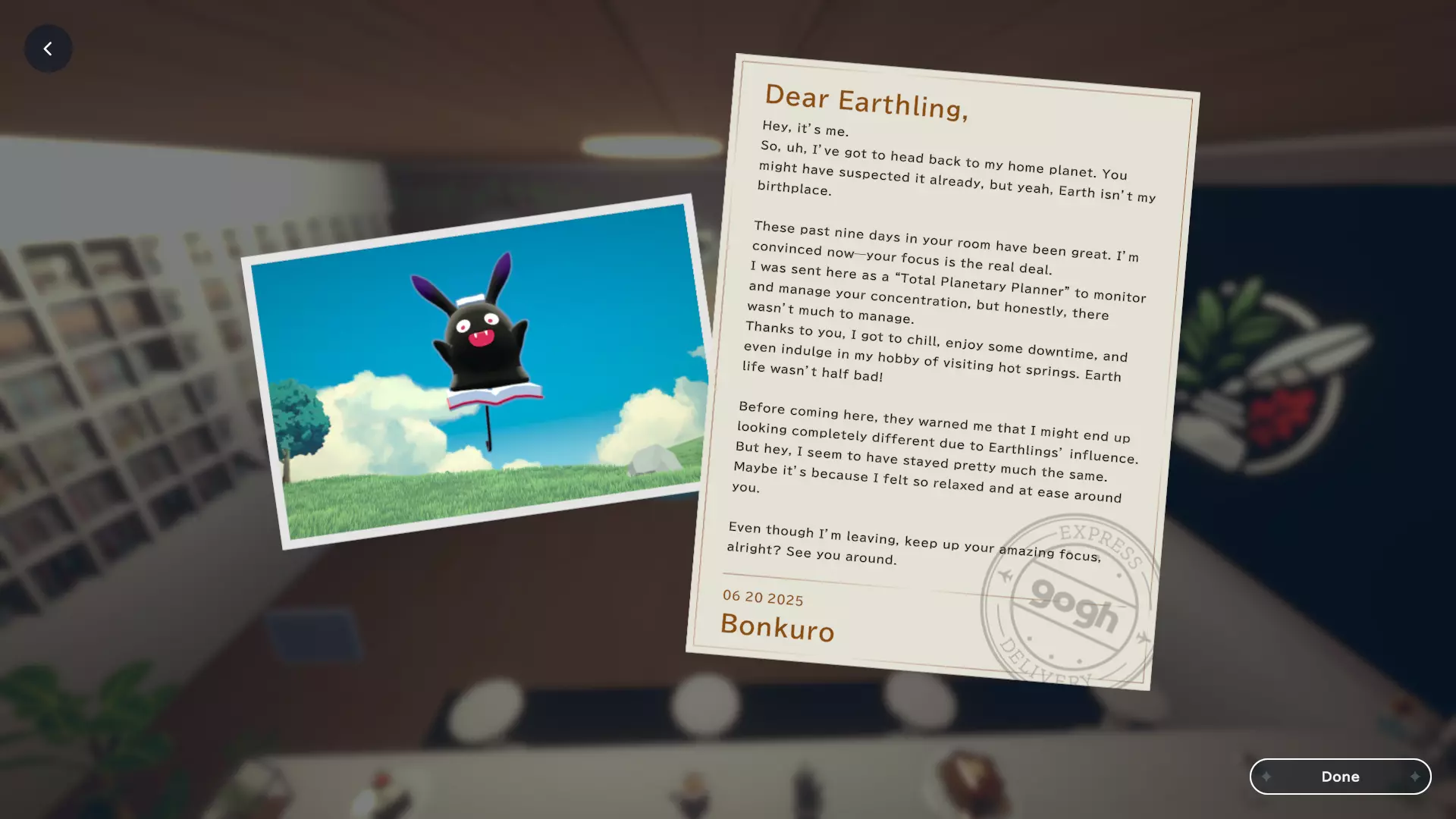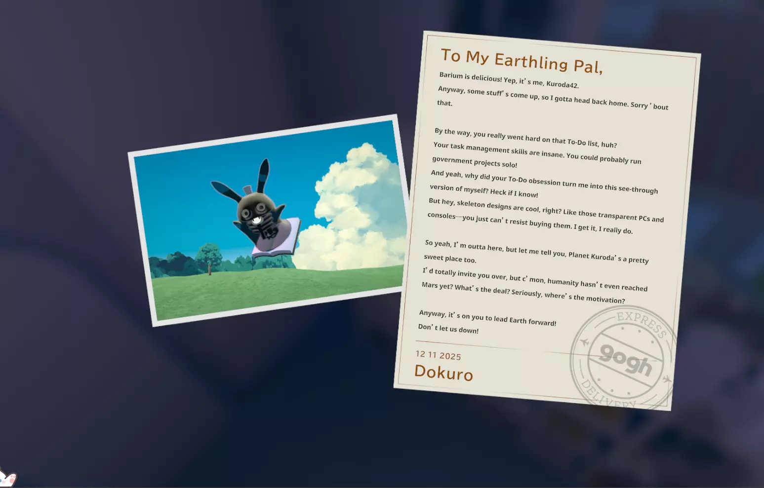我个人关于如何获取黑田24不同形态的笔记 黑田42概述 在电子游戏《gogh: Focus with Your Avatar》中,黑田42是一种神秘生物,玩家可以在工作时实时养育并观察它成长。 以下是官方网站上对黑田42的描述: 引用自《gogh: Focus with Your Avatar》:这个自称来自神秘“g”陨石的“全行星规划师”的古怪外星人,会与容易分心的人一同降临,以帮助他们集中注意力——至少它是这么认为的。它发自内心的建议往往显得滑稽地偏离目标,但嘿,它尽力了。生命周期 进化日 蛋 第1天 幼崽 第1天 孩童 第2天 成年 第5天 毕业 第10天 黑田42列表 蛋 神秘蛋 金蛋 幼崽 豆黑 孩童 噗尼黑 超酷黑 丸黑 咩咩黑 咪咪黑 波瓦黑 成年 邦克黑 咖啡黑 达利黑 多库黑 福袋黑 八咫黑 闪亮黑 桑名黑 女仆黑 马克黑 真黑 奇迹黑 星云黑 牛奶黑 猫咪黑 面包黑 飞弹黑 宇宙黑 暗黑黑 梦境黑 幽灵 【蛋】神秘蛋