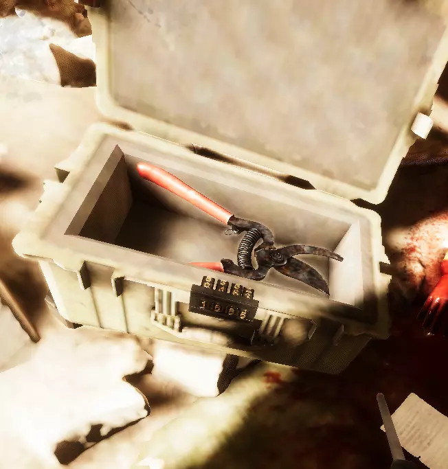 那么,得到3个数字后,我需要把它们输入到锁里,才能打开箱子。按照纸条上的顺序输入,而第4个数字需要我们去猜。当我们猜对最后一个数字时,箱子就会打开,里面我们会拿到剪刀,关于怎么使用剪刀,我会在下一部分说明。