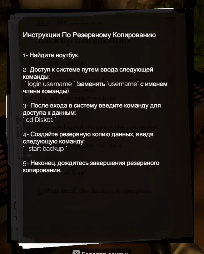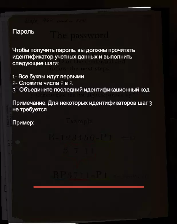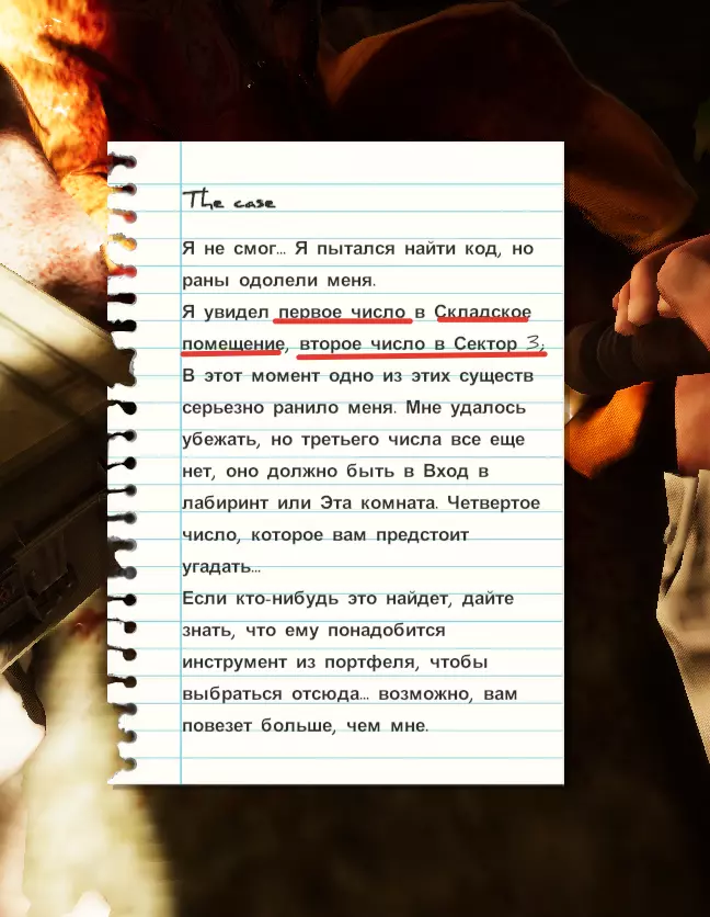 我们将要进入的房间非常重要!所以建议立即带上所有必需品,以免之后还要回来。 拿上运动传感器(不知道它有什么用,可能是用于其他结局)和金属探测器,金属探测器放在房间尽头的金属柜子上。 接下来,去看说明书。最好把它拍下来,或者记录下里面的数据,因为很难记住,但我会在攻略里留下它的截图,放心。