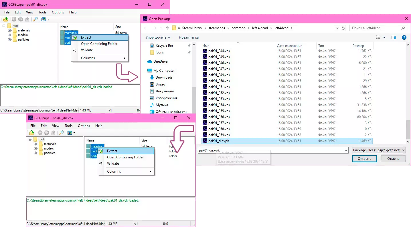 安装 我们需要GCFScape程序 安装并打开该程序。打开游戏文件夹中left4dead文件夹内的pak01_dir文件并导出文件。解压路径会自动选择为left4dead文件夹,确认后即可开始处理。