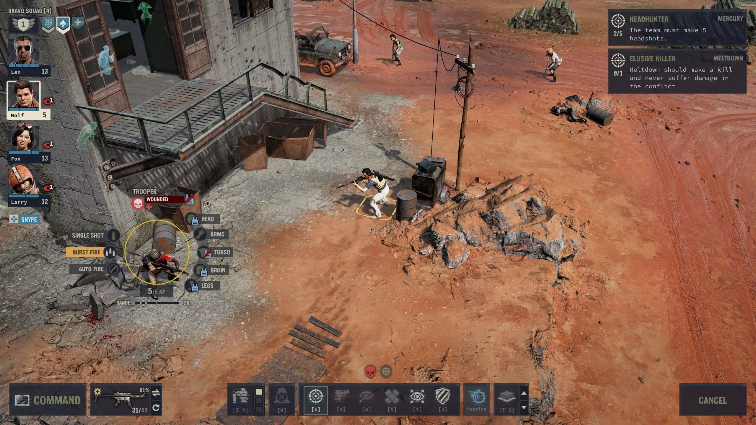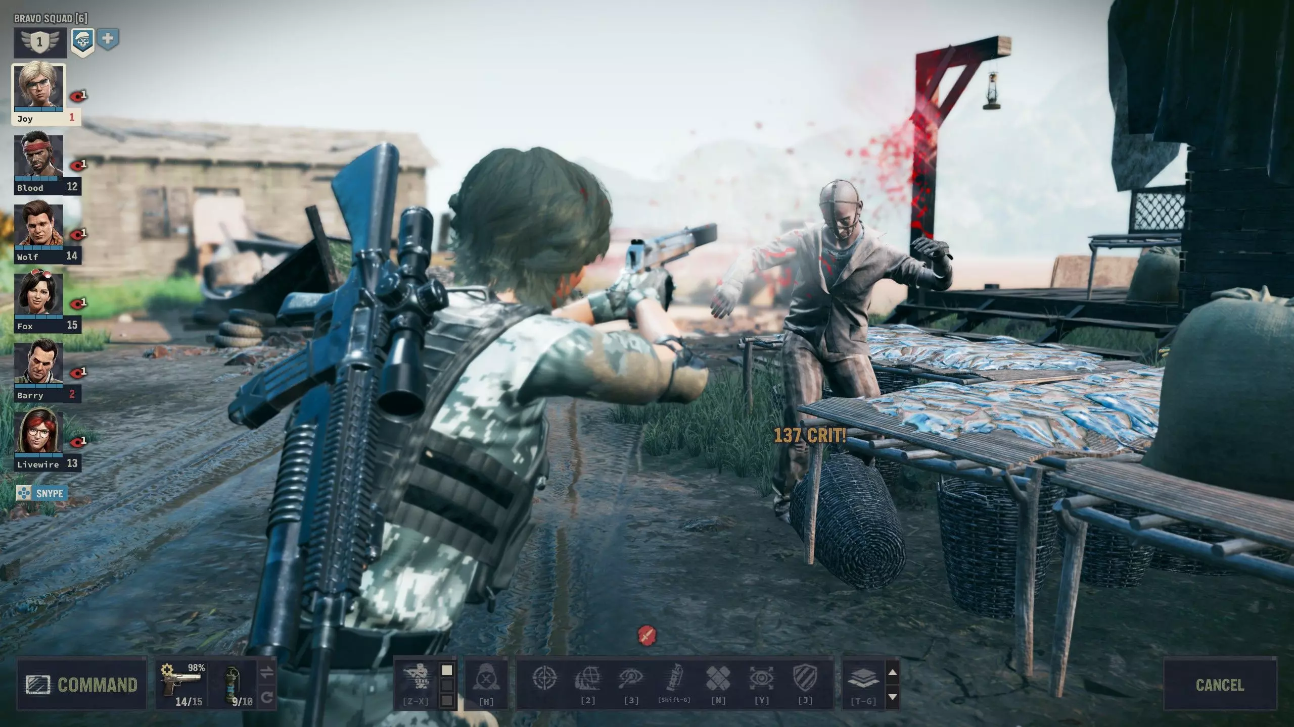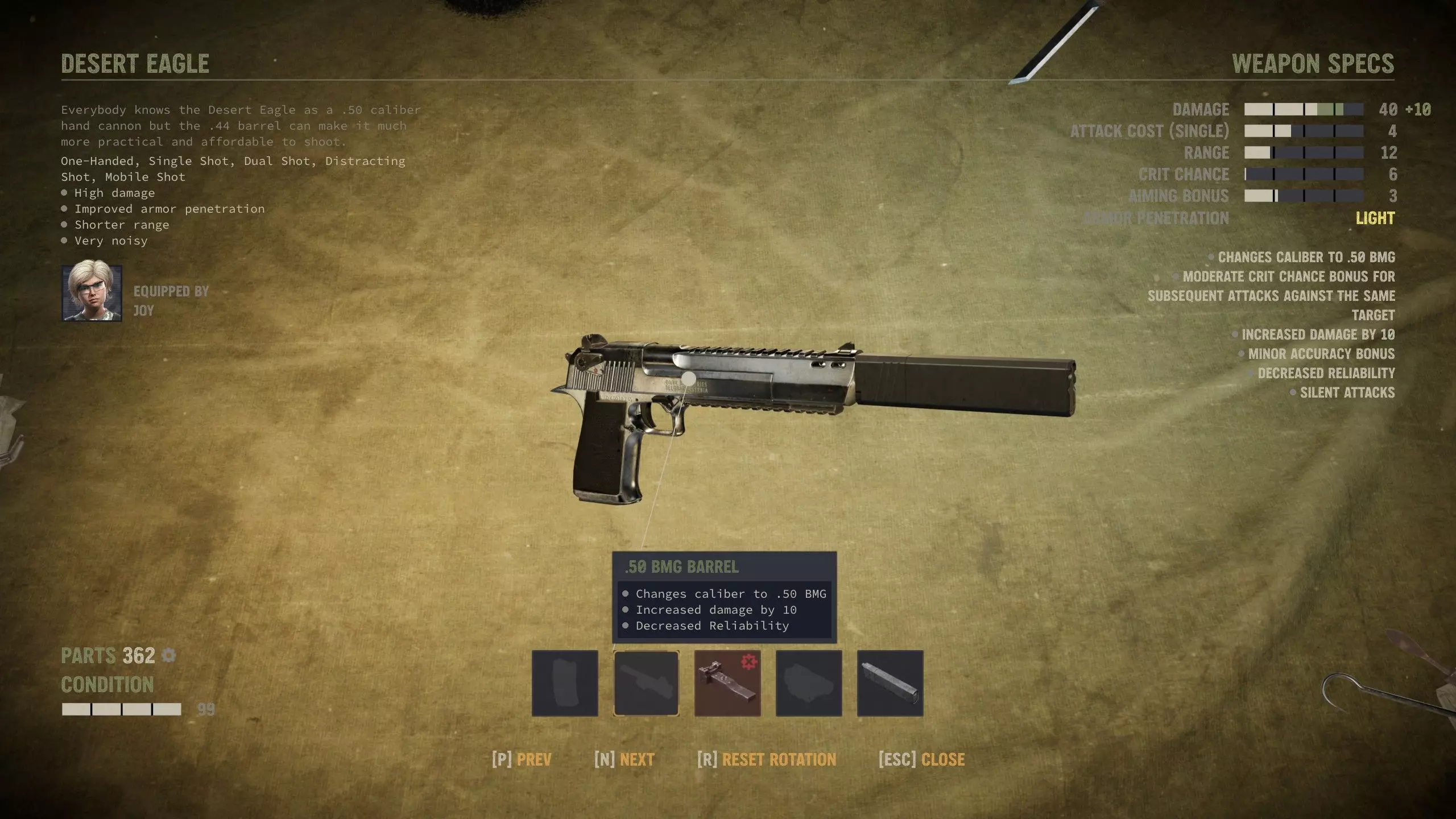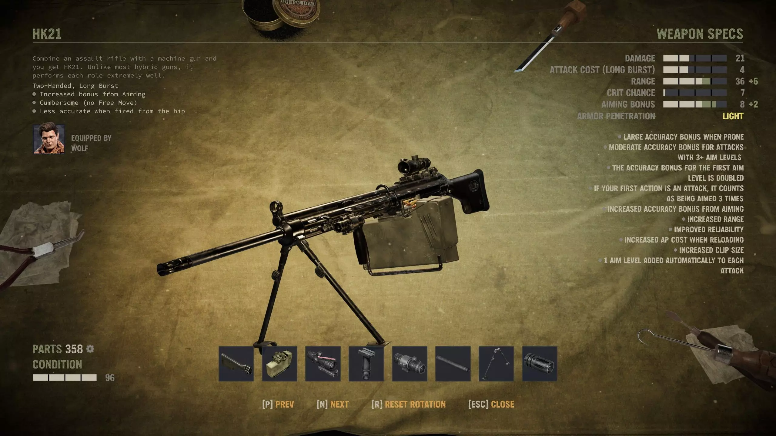 Not everyone needs a gun. Peter "Wolf" Sanderson Wolf and Fox make up an ideal fireteam and training duo, if not conversation, with Fox opening combat and Wolf backing her up with whatever works best in given situation. His talent is pretty useful and he's the most capable all-rounder in general, but his lack of traits means he'll stay in that role and cause him to become eventually eclipsed by more powerful mercs like Meltdown while on the field. Just like Blood, with Wolf's well-rounded skills, he makes for an ideal assault rifle user, thanks to adequate explosives ability. Anyway, you can do perfectly fine without Sanders and Guzzman. They are non-essential mercs despite everything. But if you don't bring either of them or the likes of Buns along, it's even more imperative that you bring other time-savers like Livewire and a high leadership I.M.P. in your first squad. Norma "Meltdown" Jessop Hurricane Norma is unironically your most stable and effective overwatch gunner as well as Psycho personality. She lacks the trait for Auto Weapons, but her talent and other traits make up for it, so long as you can manage your ammunition. Raven is also a decent choice for automatic overwatch, but I prefer Meltdown's talent for both explosions and gunnery alike as well as her cheaper price tag and creative coercion in dialogue checks. It's either her or Nails since Fidel is so moody. Ammunition reference Let's talk a little bit about ammunition and crafting before we get started on guns. The most important thing is that there's a lot of ammunition in the game. Much more than you'll ever need. Sometimes it's merely not in your squad inventory, or you have "wrong" type of ammo. But here's the good part: All bullets can kill. If you run out of 7.62 NATO and have excess of 9 mm, it just means you have been overusing powerful ammunition (something that even real world military forces think is an overkill in many places) and not using resources you have abundance of. Throughout the game, you'll largely progress from WW2 weapons to modern firearms as well as from civilian and hunting firearms to mil spec and special forces weapons. 12-Gauge Buckshot: Bread and butter shells for shotguns. 12-Gauge Sabot: Long range and narrow cone, good for short barrels. 12-Gauge Breacher: Best used in adverse visibility and with long barrels and chokes. 12-Gauge Saltshot: Good for firing when repositioning since it inflicts inaccuracy on targets. .44 Standard: Bread and butter .44 rounds for handguns and Winchester 1894. .44 Armor Piercing: Probably best saved for the Winchester in late game. .44 Match: For aiming, so don't waste this during overwatch. .44 Shock: Reduced range, but high crit. Good ammo to make if you have gunpowder. .44 Hollow Point: Good ammo to use for overwatch builds. .50 Standard: These rounds are only for Desert Eagle and the rare and elusive M82. .50 Slap: Rare and somewhat expensive, but much more effective than standard. .50 Frag: It's a good round in adverse conditions since you'll inflict burning even on grazes. .50 Explosive: Useful to secure close range kills on softer targets with the Desert Eagle. 5.56 mm Standard: Standard mil spec cartridge, most notably used on the Minimi machine gun. 5.56 mm AP: Most useful when single firing on assault rifles with light penetration. 5.56 Hollow Point: Lack of penetration is negligible downside on the Minimi. 5.56 Tracer: Useful for exposing targets for your other automatic gunners. Teamplay cartridge. 7.62 mm Standard: Aged but effective design. Used by most snipers and many automatics. 7.62 mm Match: Best on AK-74 and builds focused on aiming, naturally. 7.62 mm AP: Best on FN FAL single fire and when aiming. Usually overpenetration with AK-74. 7.62 mm Hollow Point: For crit and overwatch builds, and Run and Gun on soft targets. 7.62 mm Tracer: Same as its smaller 5.56 cousin. Use the WP version with the SMG AK-SU. 9 mm Standard: The most common ammo type. You should never be afraid of spending it. 9 mm Armor Piercing: Spend your crafting time on this, if you have the parts. It's very useful. 9 mm Subsonic: Useful on your flankers to avoid detection by unengaged enemies. 9 mm Match: Best used for stealth kills. 9 mm Shock: Good for overwatch and crit builds. No armor penetration is negligible penalty here. 9 mm Tracer: Can help your flankers expose opponents to your midliners. Flare cartridge: Cheap to use and craft. A decent light source but not usable underground. Mortar Gas Cartridge: For war crimes. The most powerful mortar shell. Mortar Cartridge: Explosive kind, but strangely low damage. Can punch holes in structures. Mortar Smoke Cartridge: It's useful in places, particularly when your backline has thermal scopes. HE Rocket: Used by RPG-7. Seemingly perfect accuracy outside of mishaps. Watch the backblast. 40 mm Flashbangs: Inflicts tiredness on epicenter, and suppressed in full radius. 40 mm HE: Inflictes bleeding on epicenter, and damage in full radius. On crafting This section is about crafting ammunition and explosives. You can craft munitions in locations with repair shop. Sectors with repair shop are usually marked by a small wrench icon on the satellite map, and you can simply check the operations menu to confirm it. The primary components needed for crafting are gunpowder and parts. You can manufacture almost every type of standard ammunition out of those, but you can also modify existing ammunition by spending only one or the other of the aforementioned components, which is often more economical, especially early on. Ammo crafting list You can make any ammunition yourself, provided you have components or standard version of the ammo. I'm not going to go through all of them here, so I'll give a handful of pointers for a priority list of sorts. 12-gauge: You cannot make variants out of standard buckshot, but making standard buckshot is pretty cheap for parts cost. You can make a whopping 40 shells with just 5 parts and 1 gunpowder. Spe