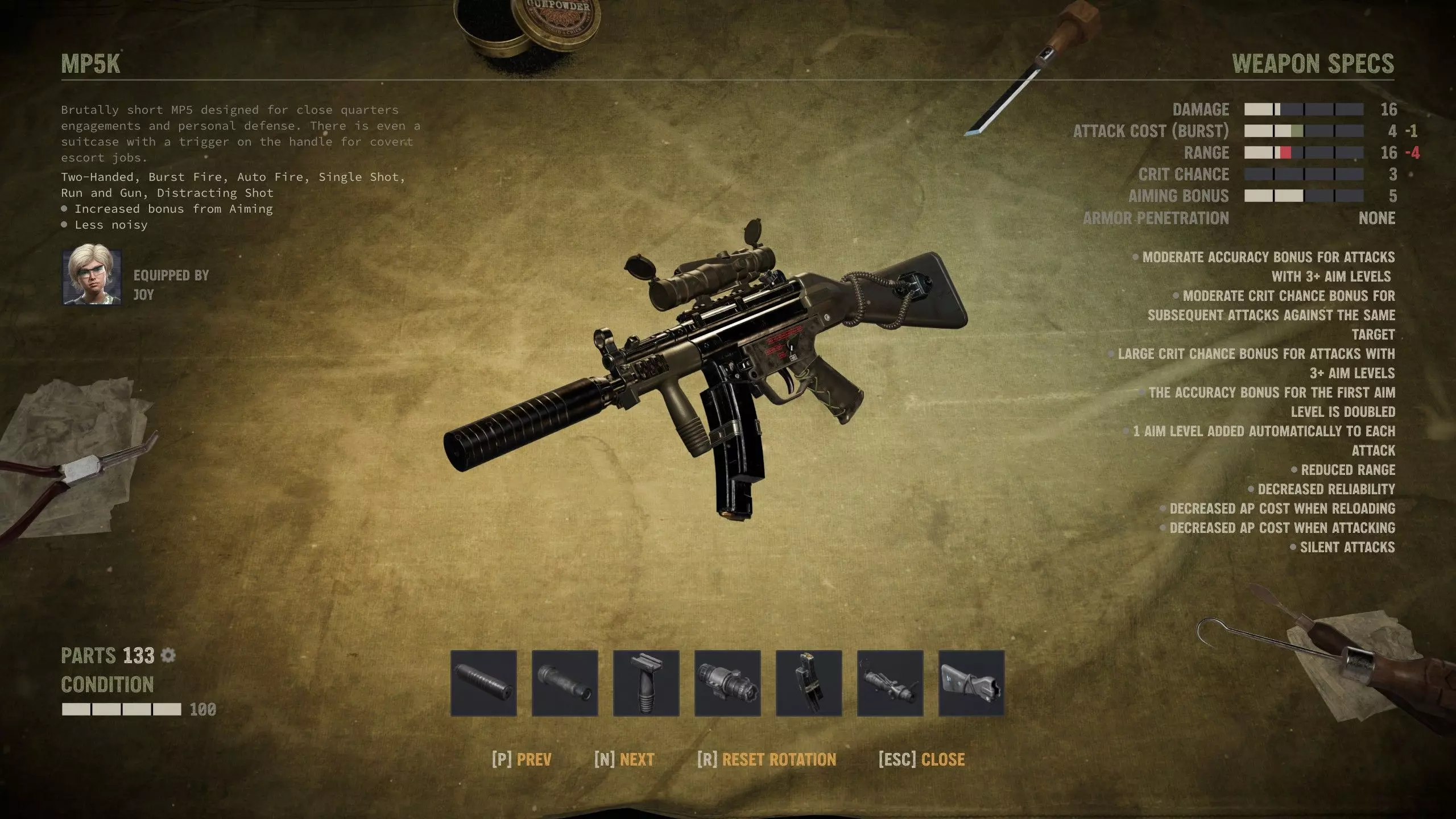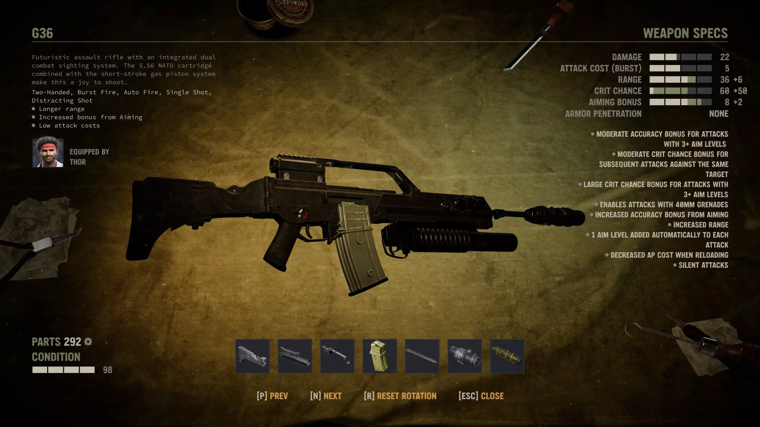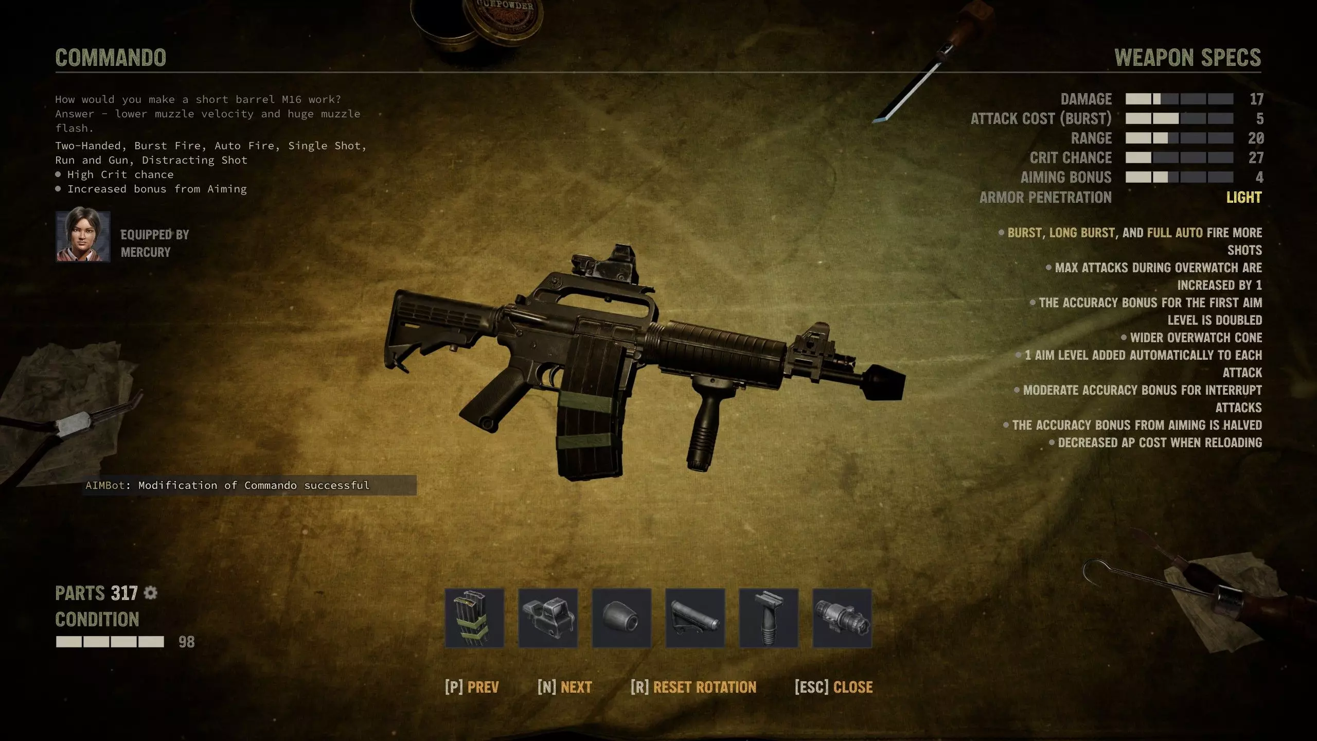 Commando (5.56) This is it. And SMG that can equip grenade launcher and every single item that running and gunning requires. Stock There's only Light Stock available option. I'd use it since most of the time you should be in position for overwatch after Run and Gun, at least if you have enough AP, which you should. Overwatch mods and R&G compliment each other. Magazine Anything except the regular expanded mag should do. You may not be swapping ammo with this as often as with MP5, but Quick Mag is always a safe bet. Sights Finally, we have AR-15 family weapon that can fit the full-sized Reflex Sight, so we'll definitely go with that. Handguard Here's the big choice you need to make. This is the only SMG that can fit grenade launcher, but it also benefits from Vertical Grip's aiming bonus immensely with UV Dot. When you can install the side assist, replace launcher with grip. Side As mentioned above, UV Dot is the best option, hands down. Muzzle You can and should get the Recoil Booster to increase burst fire (including R&G) damage bonus from +50% to +100%. It's great. Assault rifles 1 Highly modifiable and flexible Good power and accuracy but low economy Average overwatch characteristics, which is often not desirable Assault rifles are automatic rifles that fit between SMGs and full-sized rifles. Assault rifles have no special ability, but all of them are highly customizable and versatile in combat. They can fire 5.56, 7.62 NATO and 7.62 WP rounds as well as 40 mm grenades when modified with the underbarrel launcher. Common mods If you can fit a bipod or underslung grenade launcher on the gun, you should do so, if you have the parts. If you need to chose between the two, grenade launcher is best unless you already have 2 grenadiers in your squad. AK-47 (7.62 WP) Without it, a game just doesn't feel complete, right? Stock There's only Light Stock option, but you probably don't want to compromise your aiming bonuses at the stage where this weapon is most useful, and you probably don't have full overwatch builds on your mercs anyway. But if you don't like aiming, you could use it, at least if you have bipod installed. Sights Limited options. You probably don't want to spend chips or even lenses here, but you do you. Magazine Quick Mag makes it easier to swap ammo types. Expanded is not needed. Handguard There's only the Vertical Grip option, and it's okay to use. It's not compatible with grenade launcher, but you probably don't have 40 mm grenades when using this anyway. Side Not really worth spending chips or parts here, and there's no UV option anyway. Muzzle All options are viable. Damage, precision or stealth – the choice is yours. M14 (7.62 NATO) M14 could be a marksman rifle, but it's categorized as assault rifle in the game. Unfortunately it's the worst gun in its class as far as modding goes and you should never invest on it. Get the unique variant instead. FAMAS (5.56) I guess some players pick this up in early game, but it's not actually a good gun. I wouldn't spend parts or components to modify it, at least. FN FAL (7.62 NATO) The high maintenance mentioned in weapon features is a negligible drawback, but it might have some effect in overwatch use. Plenty of mod slots, but it's not the best AR for any particular build. Stock ARs aren't really good for overwatch so not need to nerf aiming just for that. Use Heavy Stock. Magazine I have never had a gun jammed in this game, but there's no much cause for extended mags on FAL either. So use Fine-tuned Mag. Sights If you're going to install Red Dot, you probably want Quick Prism Scope. Otherwise it's kinda up to the merc build you're using this on. Side Use Red Dot unless your merc has some overwatch perks you make use of. Probably not worth the chip use at any rate. Barrel You've got different options here. Heavy Barrel for high ammo economy, long barrel for good all-rounder gun, and short barrel for close quarters aiming bonuses. Pick one that suits your fighting style. Muzzle It's a long range weapon and you can reliably secure stealth kills with it, so I'd use Suppressor. Galil (7.62 NATO) Almost the same as FN FAL, with some key modding differences. It's only marginally better for crit builds so if you have a fully modded FAL, you don't need to replace it for this. Stock This gun has limited sights and no bipod so overwatch is out of question. Go with Heavy Stock. Magazine It's easier to swap ammo types with a Quick Mag. Sights You've only got four choices, but Prism Scope is ideal for crit builds. Underslung Can't fit both bipod and grenade launcher here, so grenade launcher it is. Side Galil already has good crit chance so you should put UV Dot here. Barrel You can use either option, but Short Barrel makes it easier to reap benefits from aiming to fuel crits. Muzzle You can use Compensator if you're short on steel pipes, but the Suppressor compliments crit builds best. AR-15 (5.56) The "civilian" variant of the semi-automatic rifle family that works best with crit builds. It has some "unique" modifications, which are not that effective in practice. Stock Heavy Stock is installed by default and that's all you should need. Sights By the time you get this, you should have enough lenses to spend. The gun has high crit chance so we should bolster that further with the Prism Scope. There's no full reflex sight so this is not an ideal weapon for overwatch in my eyes. Mercs with Deadly Aim can use Sniper Scope x5 to bump their critical chance slightly higher. Magazine Quick Mag is available, so we'll go with that. Underslung Grenade launcher is available, so we'll go with that. Side All four options are available. If you are swimming in chips, you can install aim assist of your choice. Barrel Extended Gain-Twist Barrel provides reliability and 25% more range. The short barrel reduces AP cost even further, potentially enabling a crit galore with Suppressor. But since there are other AR-15 family rifles, and carbines, available, I'd reco