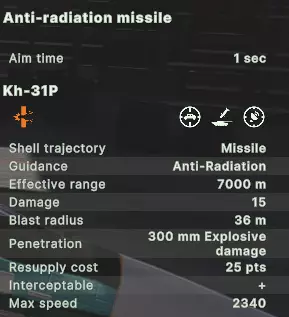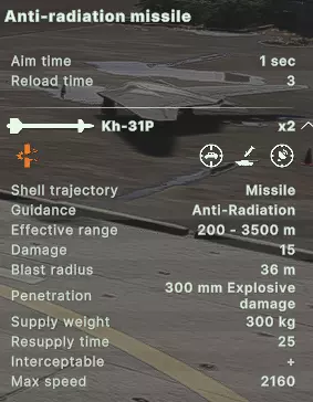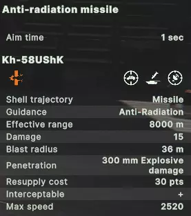 仅需一枚S-300导弹即可击落无人机,因此它只会发射一枚。 虽然这有利于弹药节约,但也意味着偶尔会有导弹或喷气式飞机突破防御。虽然不能完全依赖这一点,但在考虑为喷气式飞机加装电子对抗系统时需要记住,一次失误可能就是轰炸任务成功与失败的区别。 注意:这一规则不适用于火炮系统。 由于射程限制,它们通常一次只能锁定并攻击一个目标。 - 视线 视线(LOS)是《破碎箭头》中较为复杂的机制之一,这一点在防空压制(SEAD)和雷达系统中同样适用。防空和视线机制的具体细节相当复杂,但在SEAD(防空压制)的语境下,你只需了解以下内容: SEAD飞机需要对目标保持视线。视线会被地形和建筑物阻挡,但不会被森林阻挡。 因此,低空飞行会大幅限制敌方防空武器的射程,但同时也会缩短你的SEAD导弹射程。相反,高空飞行会增加你的SEAD导弹射程,但敌方防空武器的射程也会随之增加。 其他注意事项: - 远程防空武器可在雷达开启的情况下从森林中开火 - 远程防空武器在雷达关闭时需要直接视野 - 即使是像TOR(道尔)这样的垂直发射系统,远程防空武器的探测也会被建筑物和地形阻挡 - 近程防空武器无论雷达是否开启,都需要直接视线不过,由于固定翼飞机的飞行高度高于直升机,因此即便在森林中,只要飞机距离足够近,仍相对容易锁定目标。 说实话,这是一项较难衡量的机制,即便在测试时我也得到了一些不明确的结果。如果有人掌握更准确的相关条件,鉴于视线(LOS)机制似乎相当复杂,这些内容或许更适合放在另一篇指南中,但我仍十分感谢你能提供更多信息。 武器 目前,游戏中有4种反辐射压制(SEAD)导弹。 Kh-58UShK、Kh-31P和AGM-88在使用上基本相同,均为空中平台携带的远程反辐射压制导弹。AGM-122“佩枪”空地导弹的独特之处在于其射程较短且伤害较低,但由相对廉价的平台携带,单位价格也更低。Kh-58UShK反辐射导弹