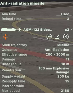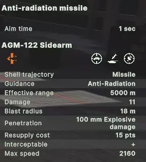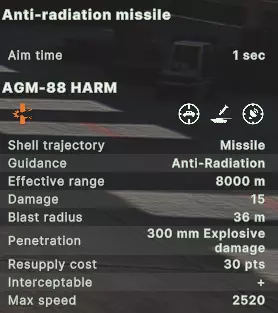 AH-1W 超级眼镜蛇(直升机)、AH-1Z 蝰蛇(直升机)、AV-8B 鹞 II Plus 部分直升机(AH-1W 超级眼镜蛇、AH-1Z 蝰蛇、Ka-52K 短吻鳄)可搭载的SEAD导弹型号射程较短,但具备独特优势:若切换至雷达模式,能压制近程防空系统;同时,它们非常适合猎杀后方的远程防空阵地。