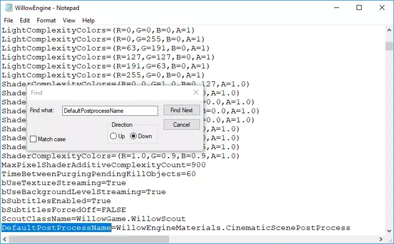 现在,搜索“DefaultPostprocessName”;找到后,注意等号右侧有两次“Willow”,就像这行所示:DefaultPostProcessName=WillowEngineMaterials.WillowScenePostProcess。现在,将第二个“Willow”替换为“Ryan”,或者若要去除 bloom 效果,则替换为“Cinematic”。