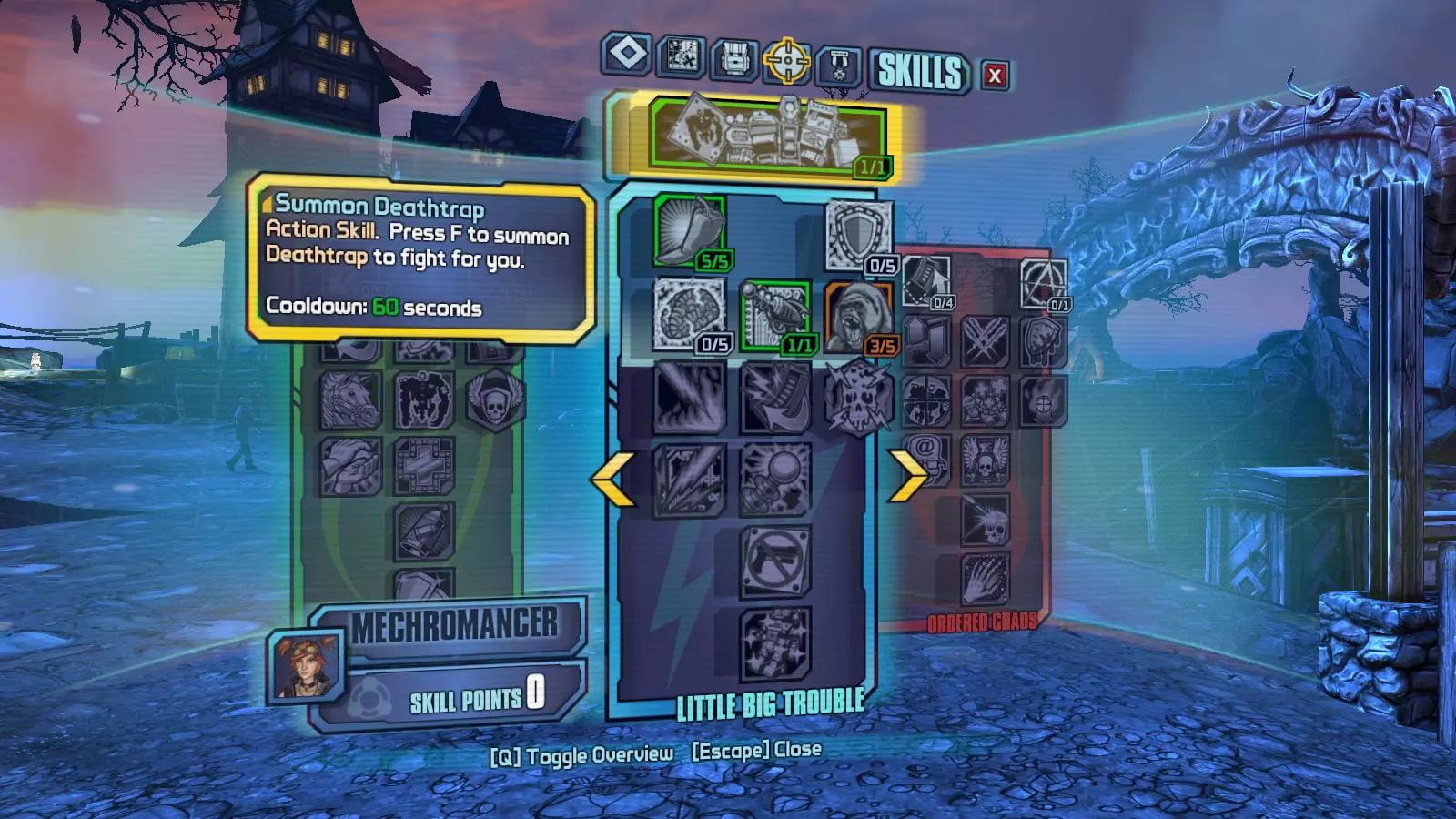 如果你使用盖奇(机械术士)作为主力角色,那么在游玩过程中会自然解锁这个成就。如果不是,当你达到2级时会获得2个技能点,此时就可以开始召唤死亡陷阱了。下面的图片展示了我在6级时是如何做到的。