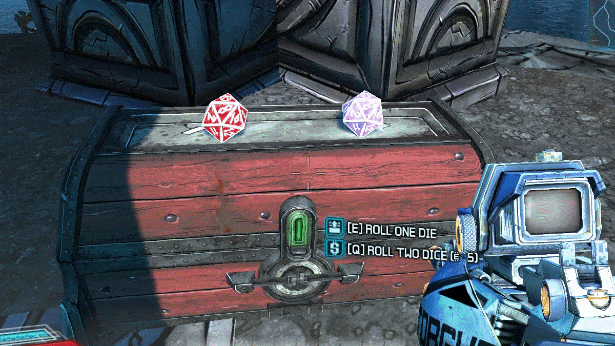 你自然会遇到顶部有2个骰子的箱子。你会看到2个选项:【E】掷一个骰子,【Q】掷两个骰子【消耗5点】。第一个选项花费1点,第二个选项花费5点埃里迪um。无论你选择哪个,掷骰子时都会出现一个数字。下图中显示的是8。但当掷出1或20时,成就就会解锁。在【后末日】支线任务中,你会在【凄凉码头】(位于【荒凉废墟】区域)遇到第一个这样的箱子。
