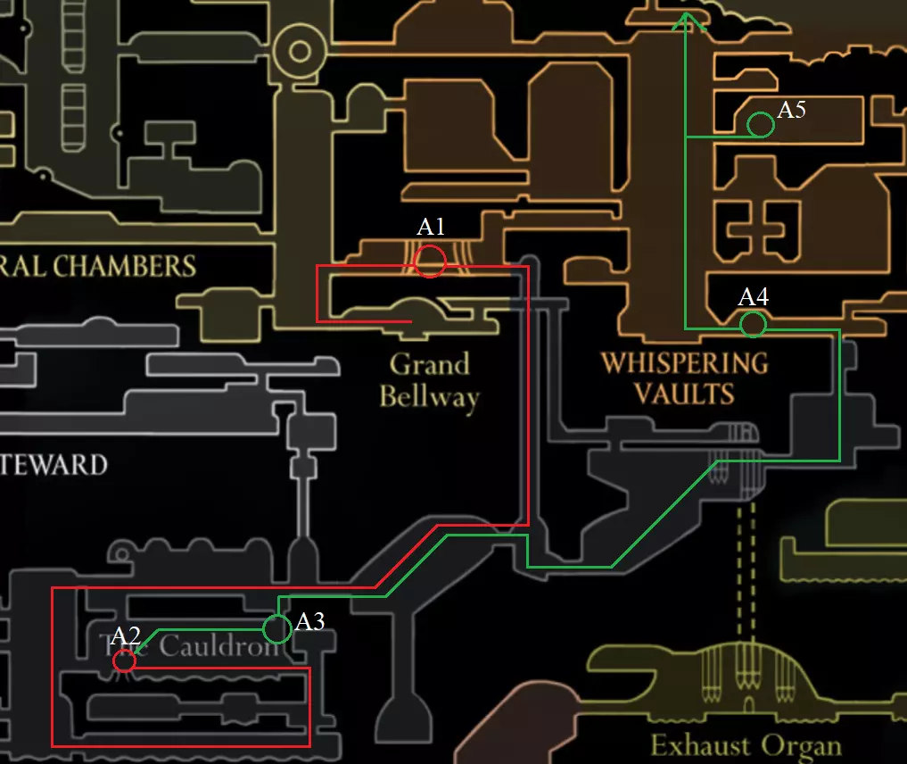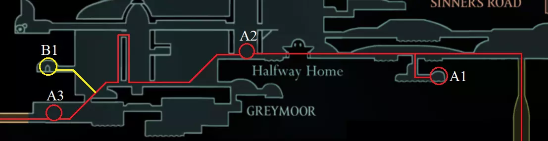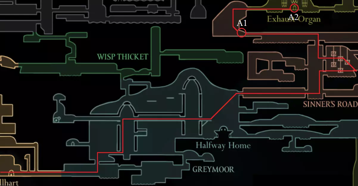 第二幕流程 接下来我们将前往【迷雾】区域。 简而言之,使用飞蛾附近的捕虫网,它们会为你指明正确的道路。 A1 【迷雾】区域的入口在可破坏的墙壁后面。 A2 穿过【迷雾】后,你会进入【器官排放口】区域,击败 boss【幻影】。 乘坐电梯上去,即可进入第二幕。