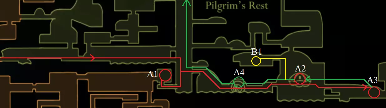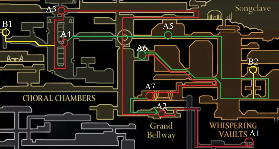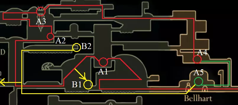上层大厅 A1 从这里开始是游戏中相当困难的部分。 A2 在长椅上存档,因为接下来会进入这个关卡中最难的竞技场。 A3 通过困难的竞技场。 A4 获得第二首歌。