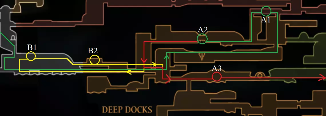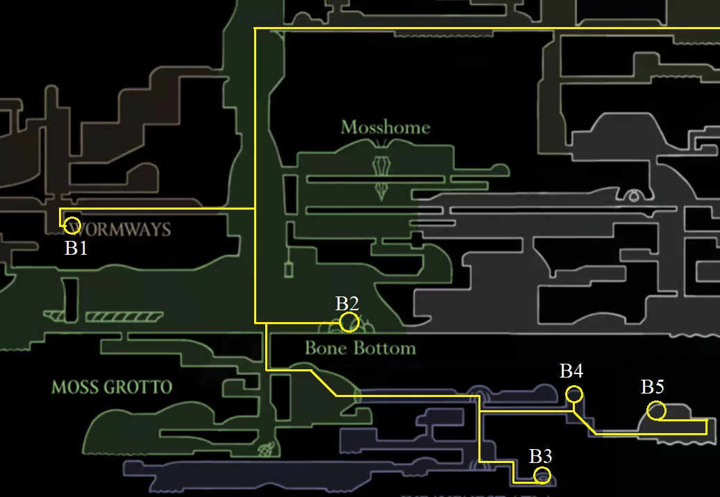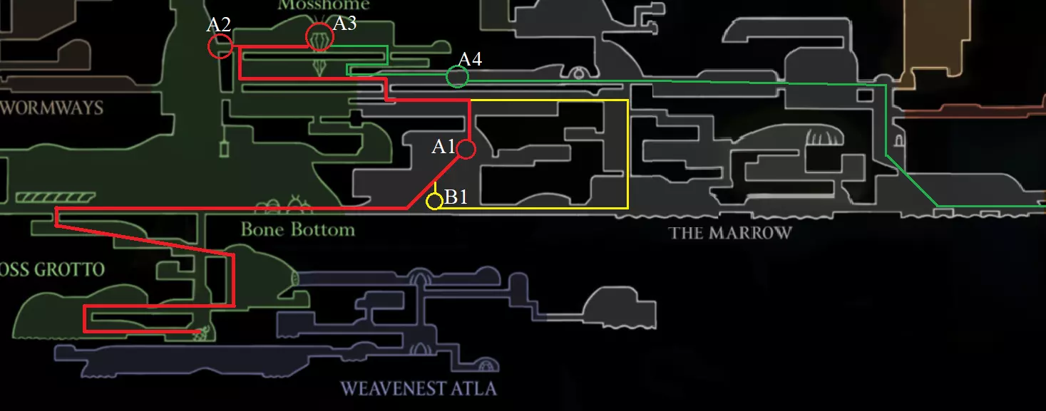 获取成就【Скоростное прохождение】和【Стальная душа】的详细地图指南 引言 开始之前,先列出你需要满足的条件: 1. 无需游戏内地图即可熟悉各个区域 2. 具备一定的“技巧” 3. 保持耐心 4. 绝对不要冒险 重要提示:可以在暂停菜单中查看本指南,这不会影响你的竞速时间。这里不会详细说明 boss 战的战术,毕竟我们没资格教你怎么玩。 保持生命值处于最大值,并且只有在生命值满的时候才消耗丝绸释放法术。否则,在受到一次攻击后,你将只剩下 1 点有效生命值,并且无法恢复。 本指南更侧重于【钢铁意志】模式,而非经典游戏模式。如果你是硬核玩家,强烈建议走所有黄色路线(除第一张图外),以便在接近尾声时拥有4点有效生命值,从而提高生存几率。 通关大约需要2-4小时。 第一幕 丝绸长矛 A1 利用蜘蛛和“弹簧跳”技巧跳过竞技场。 B1 否则,就通过竞技场。A2 领取给霍拉的指令,以后会用到。A3 习得技能【丝绸长枪】。A4 击败钟楼巨兽,然后穿过骸骨进入深海码头。
