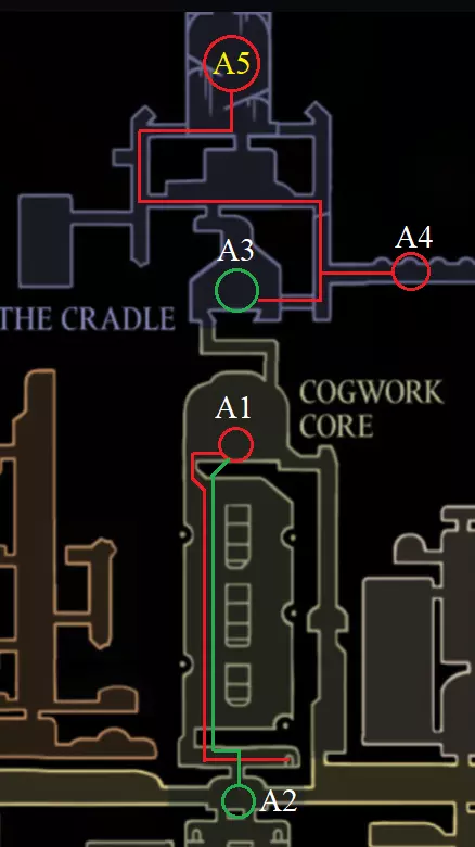 A1 攻略竞技场。 B1 打开大门。 A2 使用召唤按钮(默认按键为V键/手柄R3键)将伪色鸟引向自己。当它飞至高处后,像之前一样进行“弹簧跳”。 A3 获取技能【粘性抓取】。 A4 击败 boss 寡妇并获得【针嘴】。A5 我们出售沿途找到的所有东西,升级钉子并开放车站。 如果你使用【猎人】印记,强烈建议去找伊芙升级印记。 B2 完成迷你跑酷,获取3/8的面具碎片。