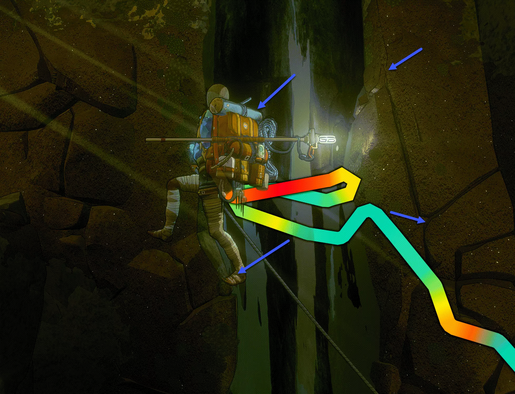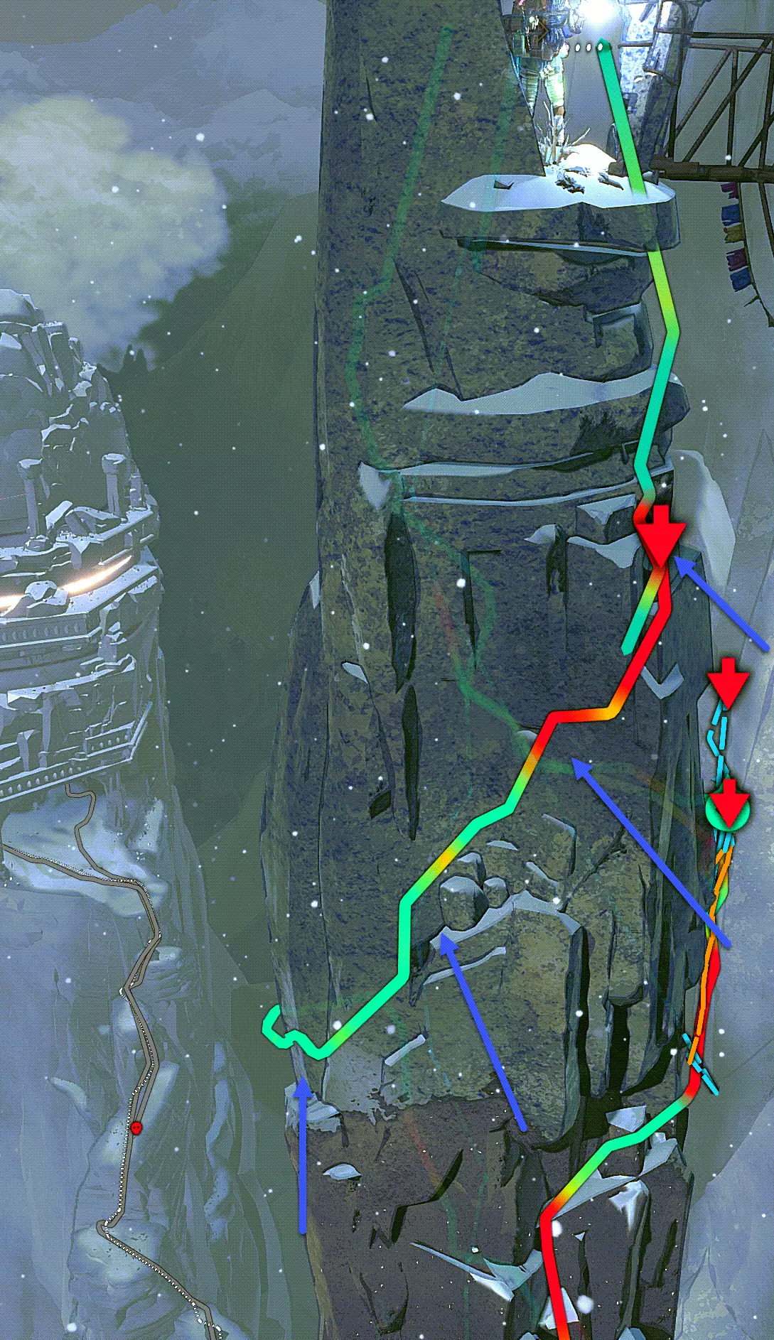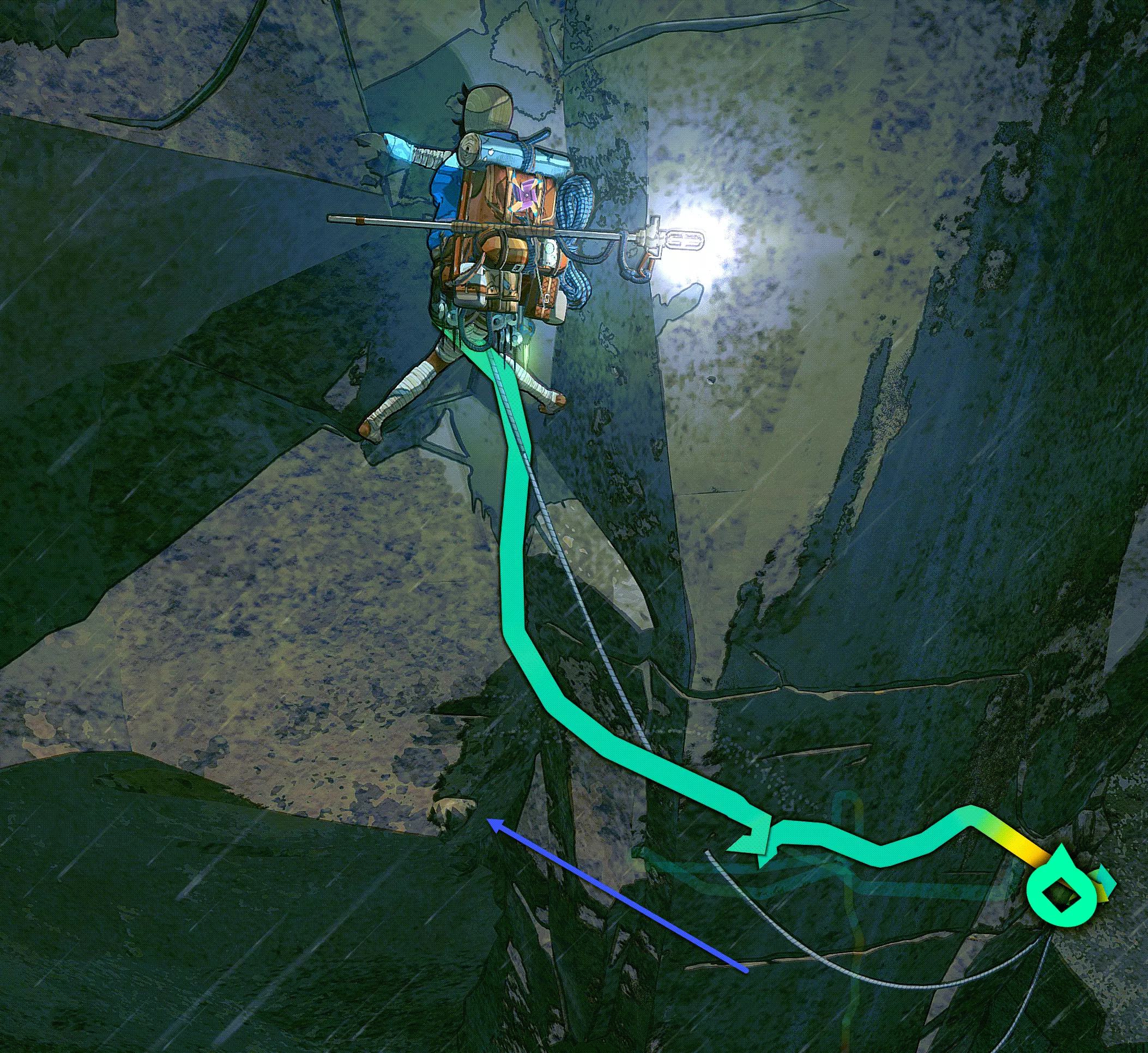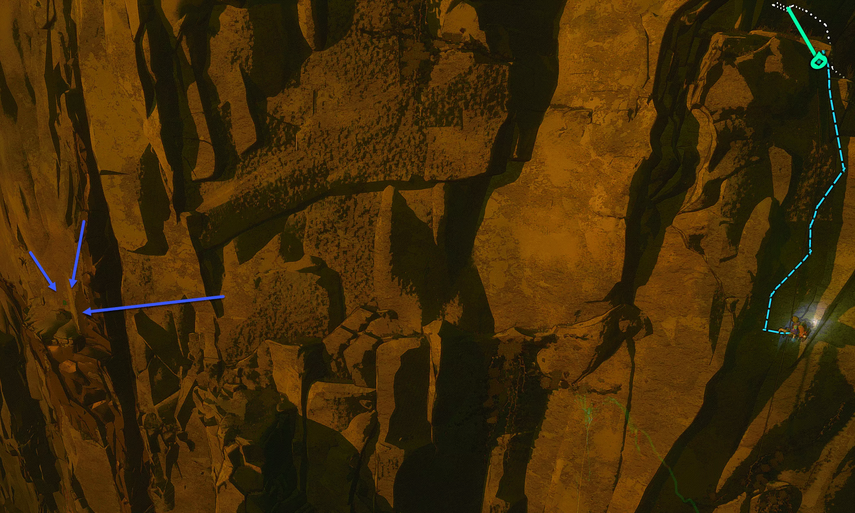 之后你们可以选择横向穿过,或者向下垂降(跟随蓝色箭头)。