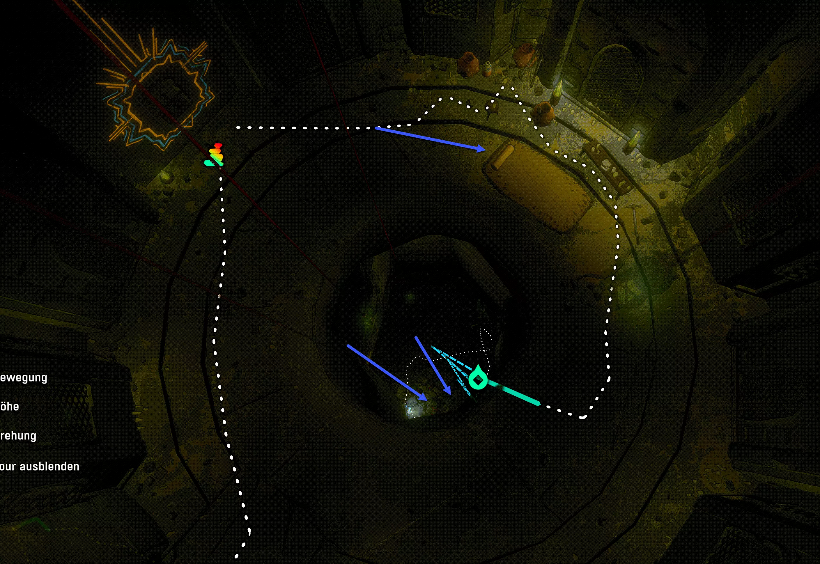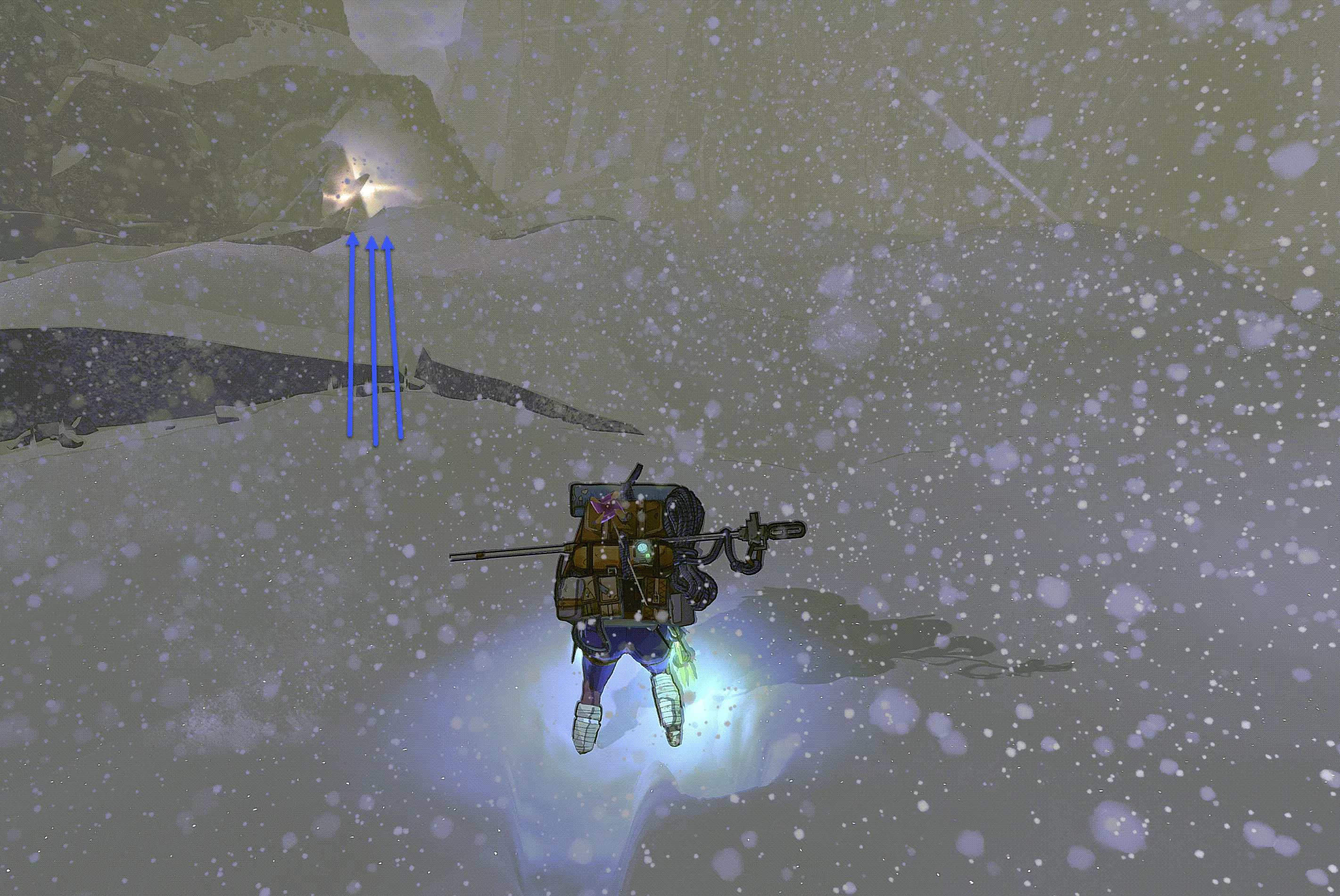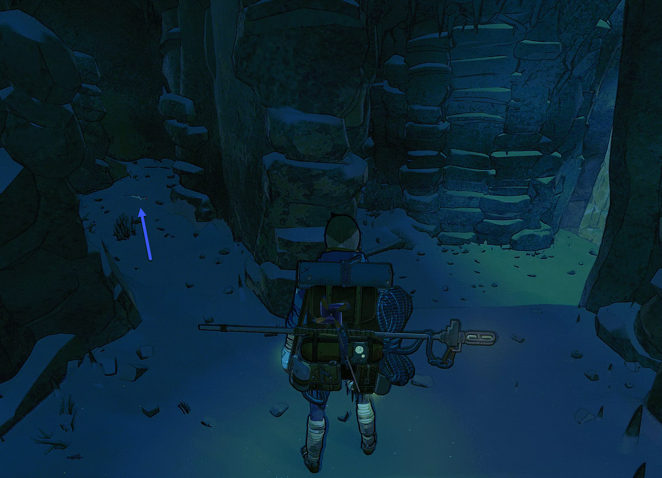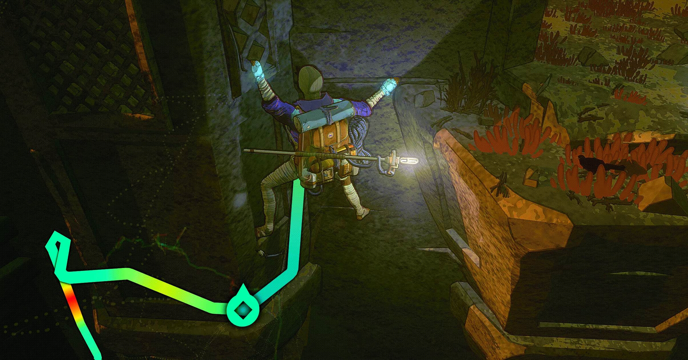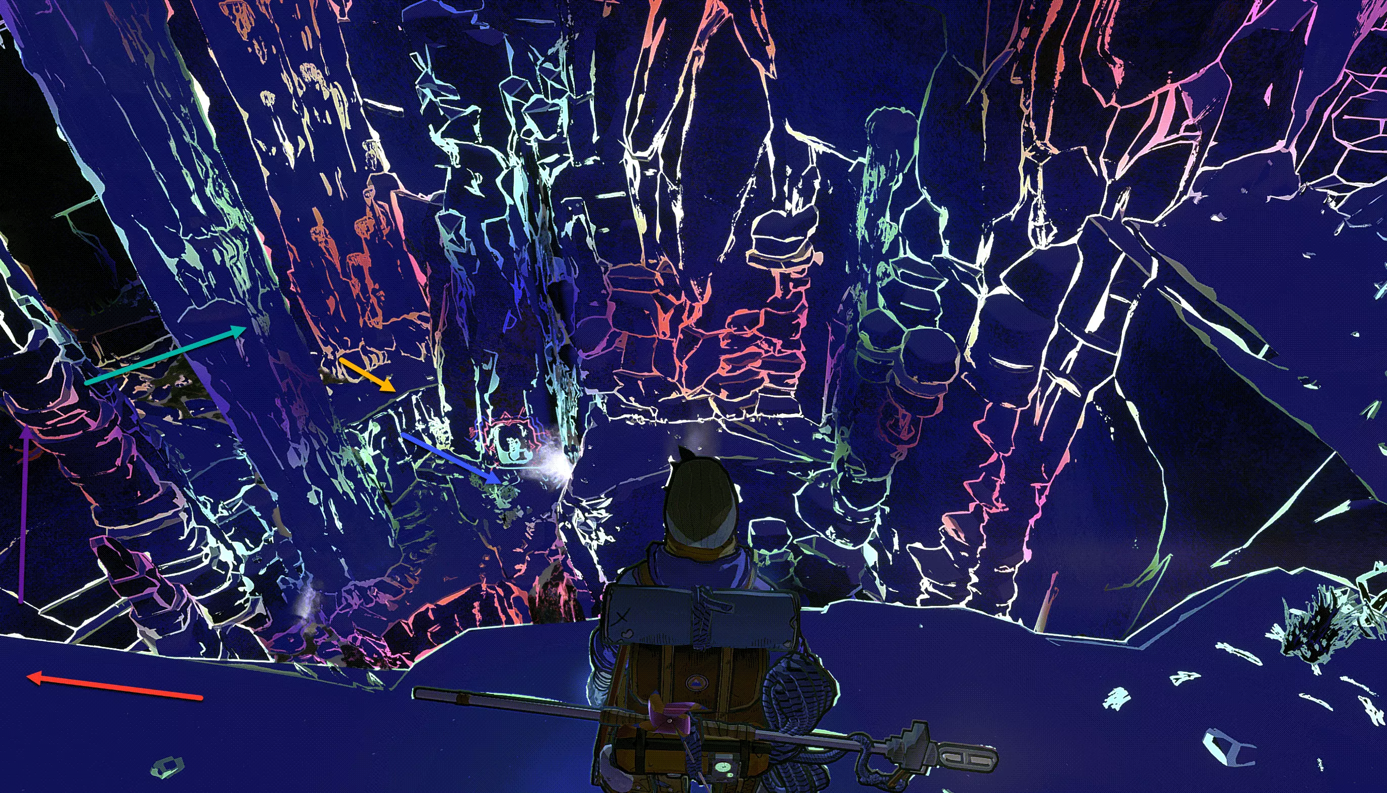 之后你们可以选择横向穿过,或者向下垂降(跟随蓝色箭头)。