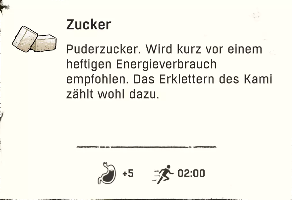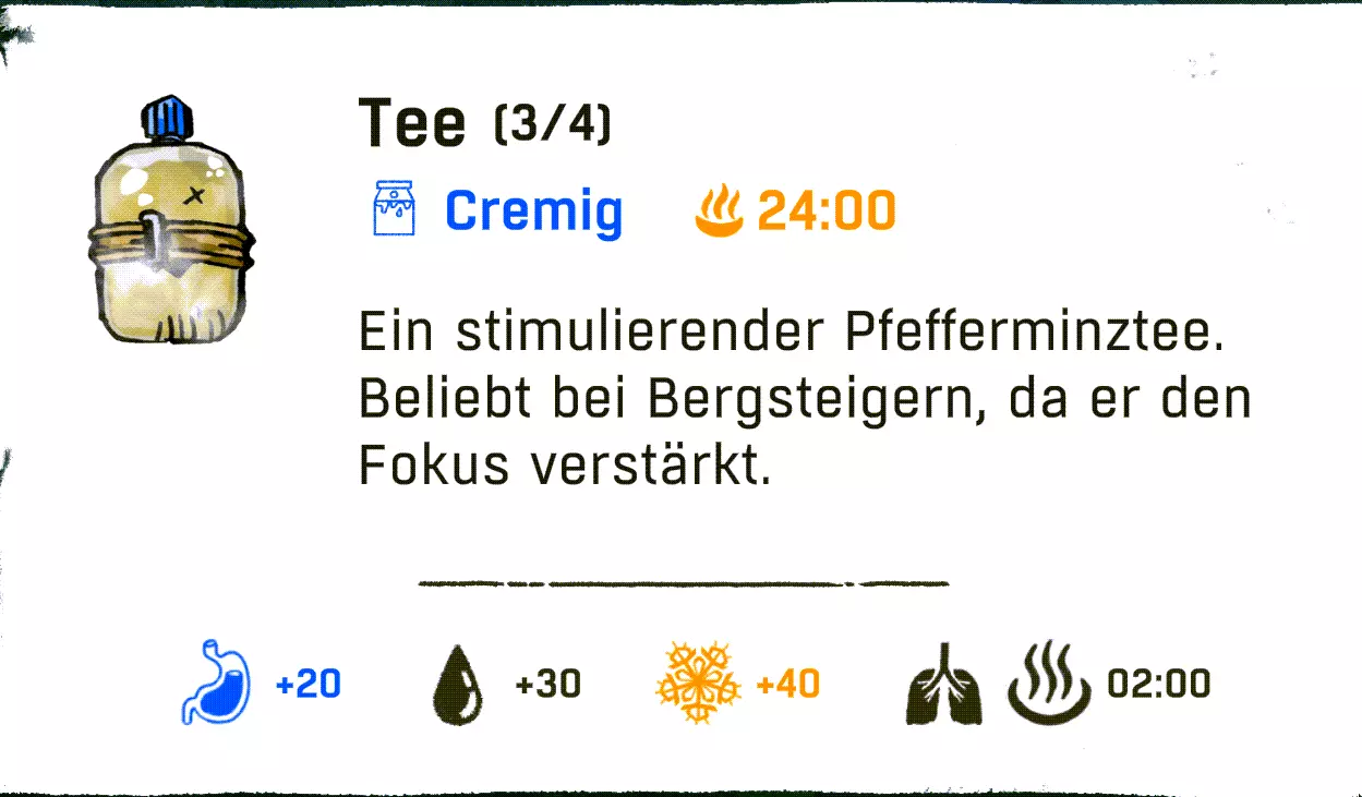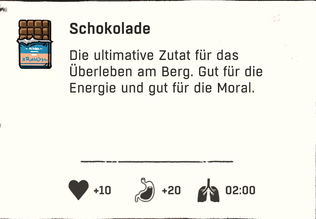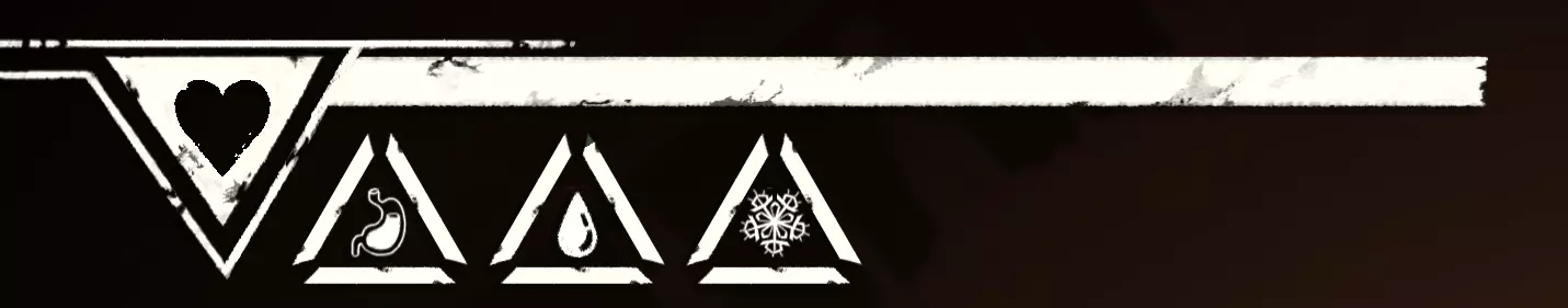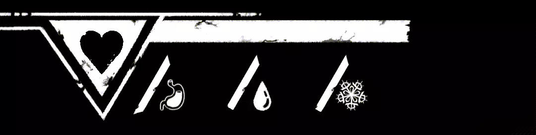 游戏中共有4种状态需要我们留意。 生存计量条=长长的白色条是我们的生命值(仅在营地或坠落时可见)。 攀爬时的耐力则无法直接看到,需要通过角色的生理反应来判断,例如肌肉颤抖和呼吸。更多内容见【攀爬基本原理】。 其正下方从左到右依次为:饥饿、口渴和寒冷。 这三种状态会随时间自动减少,并在临界状态时显示。 我们可以通过颜色变化来察觉:白色=出现问题(从此刻起消耗速度加快),红色=临界状态(我们会损失少量生命值)。当红色状态条也完全耗尽后,我们每进行一次攀爬都会逐渐失去生命值。 我们可以随时通过饮用水瓶里的水来防止脱水。 只有在坚实的地面上,或者当我们被困在山里时使用【解除安全装置】功能,才能解决饥饿问题。无保护攀爬时,我们无法使用背包。 寒冷在游戏后期尤为重要,可以通过饮用酒精(也不知道是谁想出来的主意 :D)以及其他热饮来抵御。 增益效果