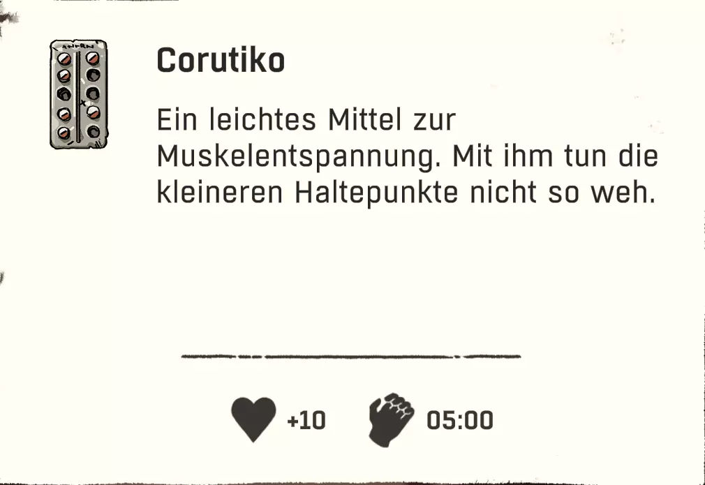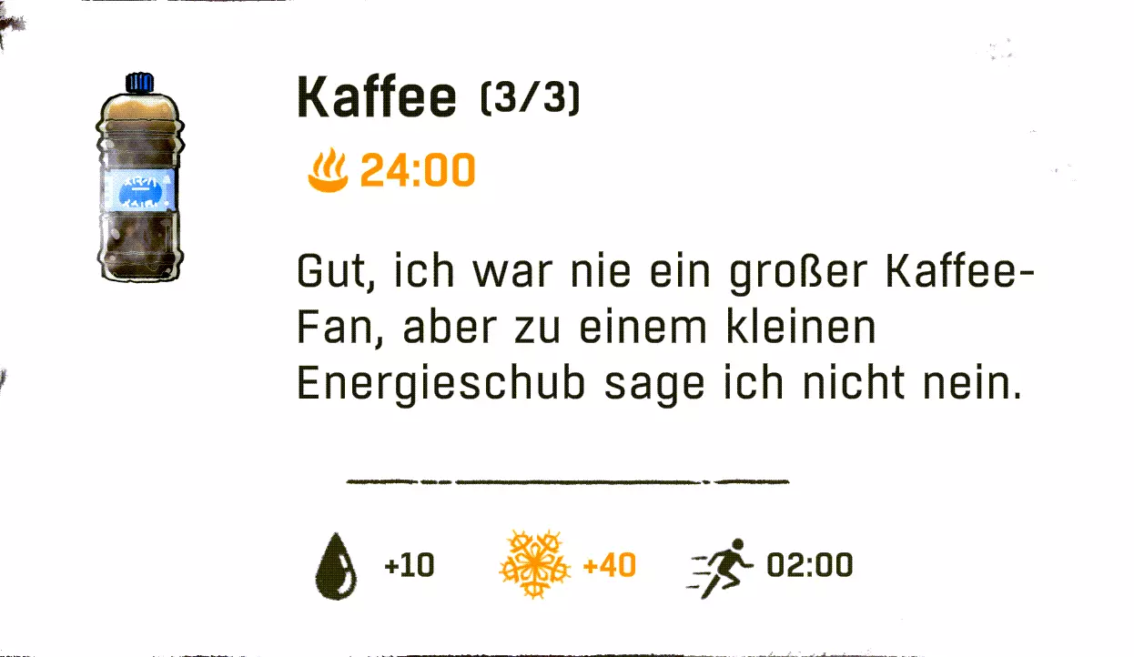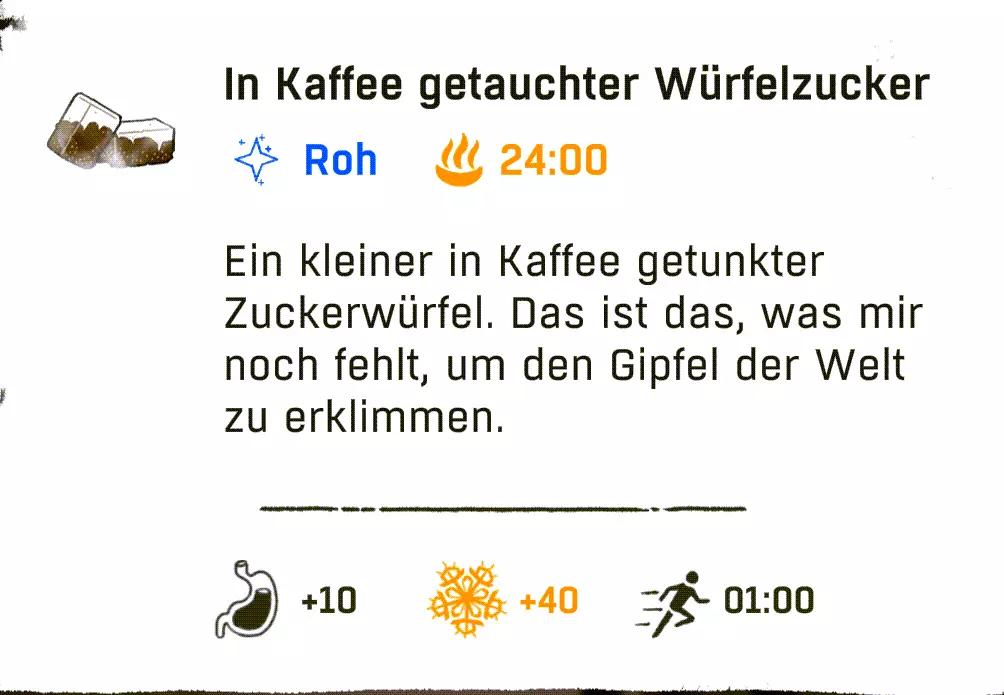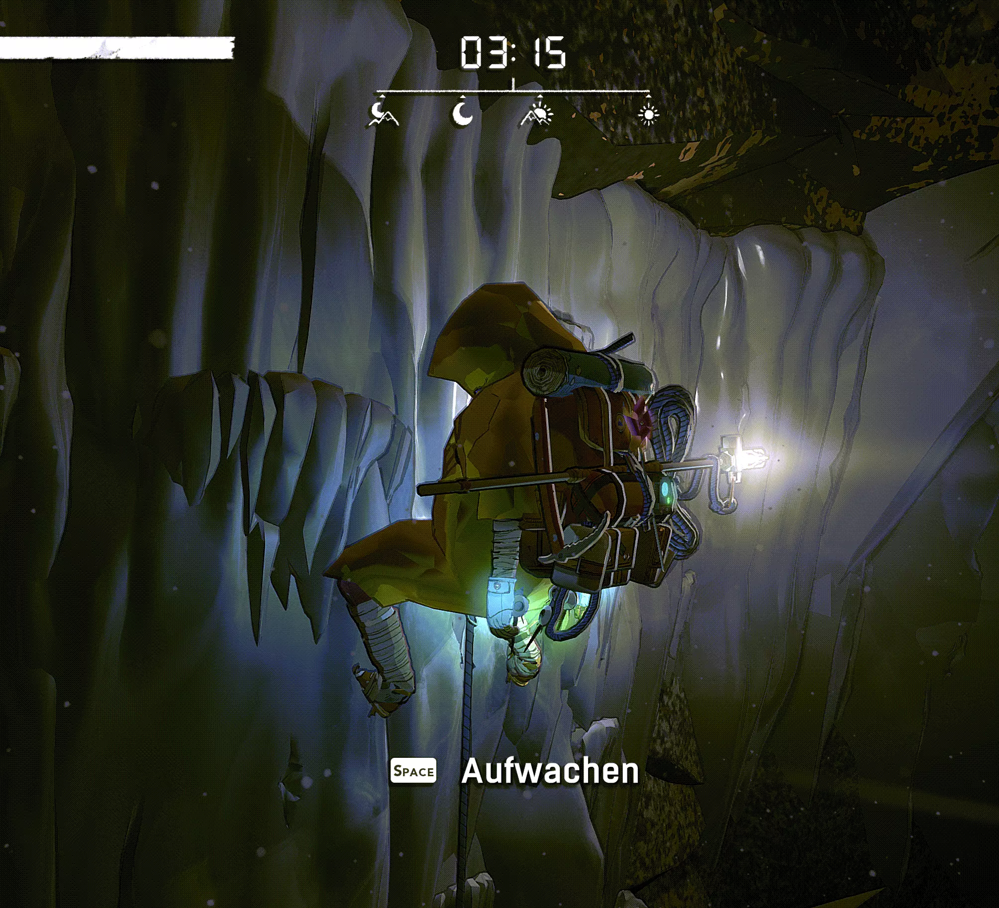 游戏中共有4种状态需要我们留意。 生存计量条=长长的白色条是我们的生命值(仅在营地或坠落时可见)。 攀爬时的耐力则无法直接看到,需要通过角色的生理反应来判断,例如肌肉颤抖和呼吸。更多内容见【攀爬基本原理】。 其正下方从左到右依次为:饥饿、口渴和寒冷。 这三种状态会随时间自动减少,并在临界状态时显示。 我们可以通过颜色变化来察觉:白色=出现问题(从此刻起消耗速度加快),红色=临界状态(我们会损失少量生命值)。当红色状态条也完全耗尽后,我们每进行一次攀爬都会逐渐失去生命值。 我们可以随时通过饮用水瓶里的水来防止脱水。 只有在坚实的地面上,或者当我们被困在山里时使用【解除安全装置】功能,才能解决饥饿问题。无保护攀爬时,我们无法使用背包。 寒冷在游戏后期尤为重要,可以通过饮用酒精(也不知道是谁想出来的主意 :D)以及其他热饮来抵御。 增益效果