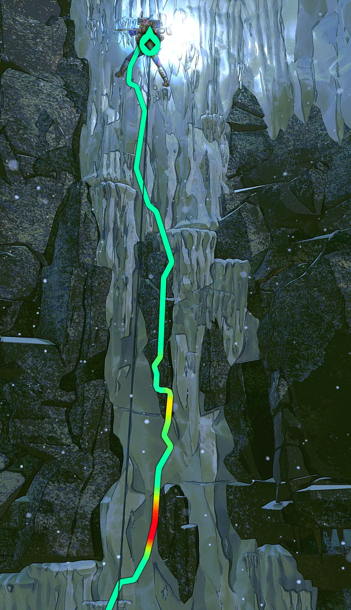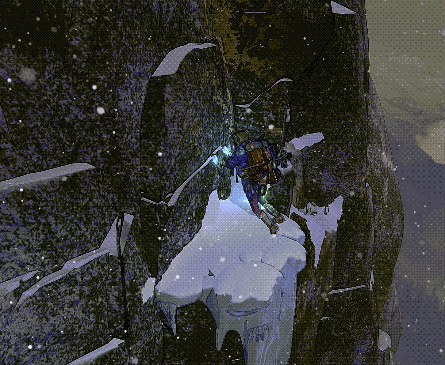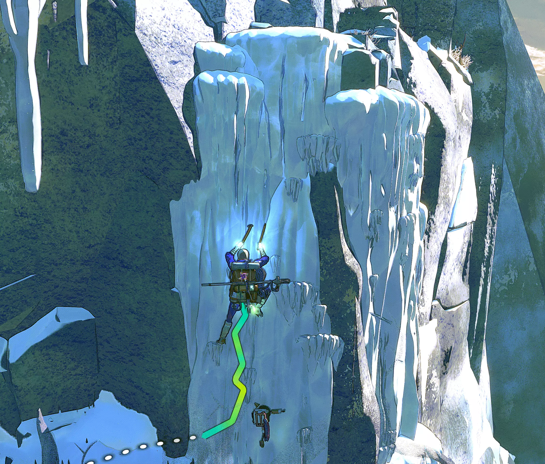 冰攀 在游戏的最后三分之一阶段,当气温变得更低、天气更加狂暴时,我们会遇到坚固的冰层。这里的攀爬方式与岩壁攀爬类似。我们用手使用冰镐,用脚使用冰爪。 主要区别在于,我们应该通过按住鼠标左键来为冰镐和冰爪的下一步动作蓄力。松开时,我们会更用力地插入冰中,从而获得更高的稳定性。在这里,我们同样需要寻找突出部分和裂缝。不过,你们仍需预留出略微增加的攀爬时间。我们还可以在冰中设置常规的保护装置。粉笔在这里不起作用。 生存与增益效果