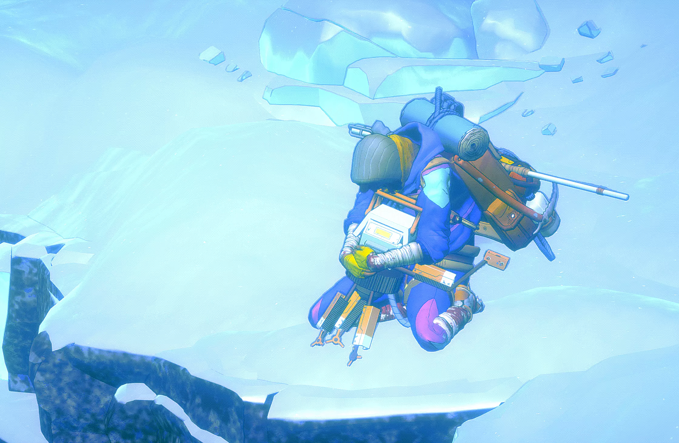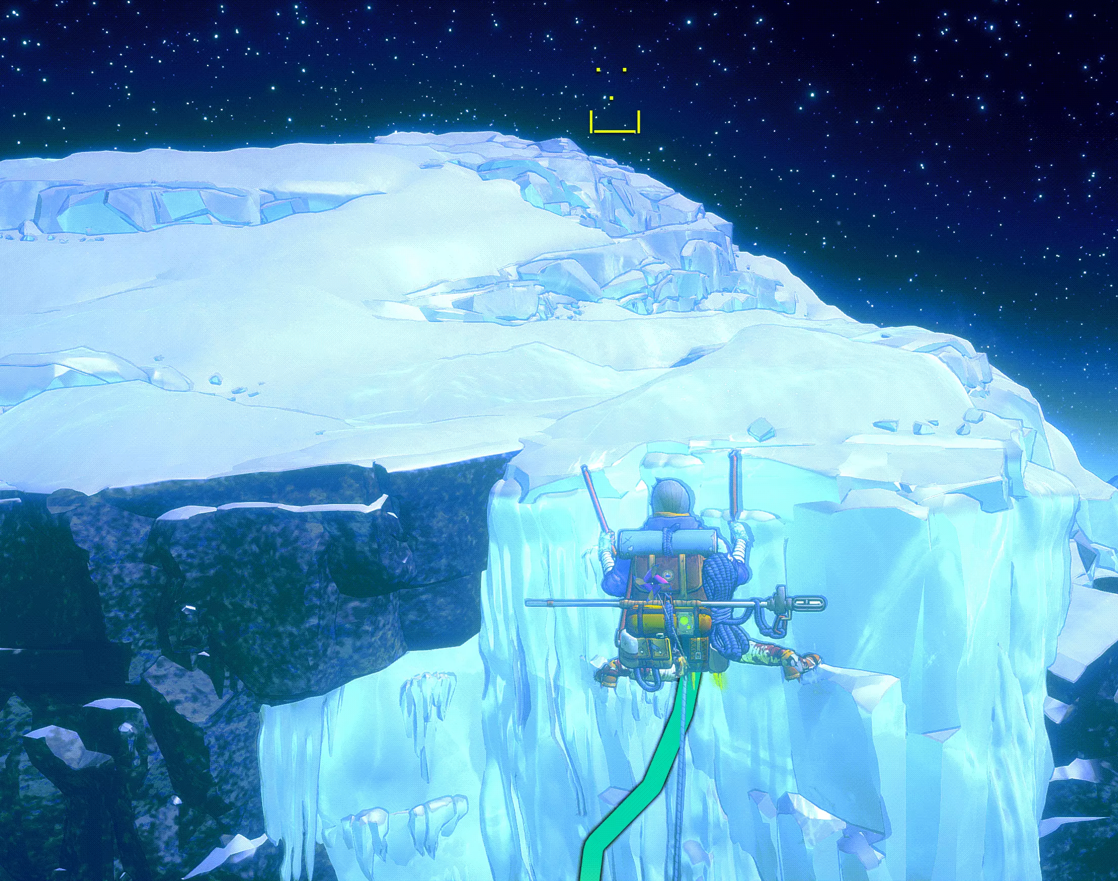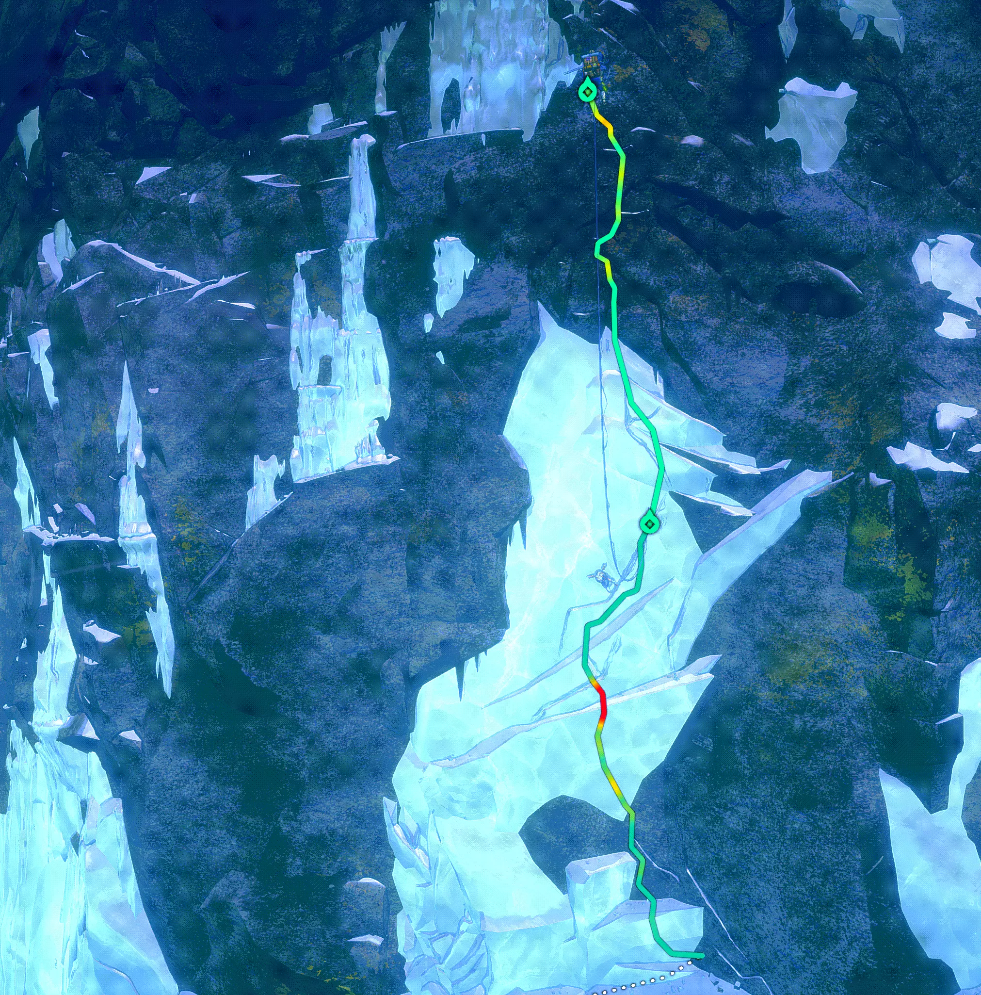 冰攀 在游戏的最后三分之一阶段,当气温变得更低、天气更加狂暴时,我们会遇到坚固的冰层。这里的攀爬方式与岩壁攀爬类似。我们用手使用冰镐,用脚使用冰爪。 主要区别在于,我们应该通过按住鼠标左键来为冰镐和冰爪的下一步动作蓄力。松开时,我们会更用力地插入冰中,从而获得更高的稳定性。在这里,我们同样需要寻找突出部分和裂缝。不过,你们仍需预留出略微增加的攀爬时间。我们还可以在冰中设置常规的保护装置。粉笔在这里不起作用。 生存与增益效果